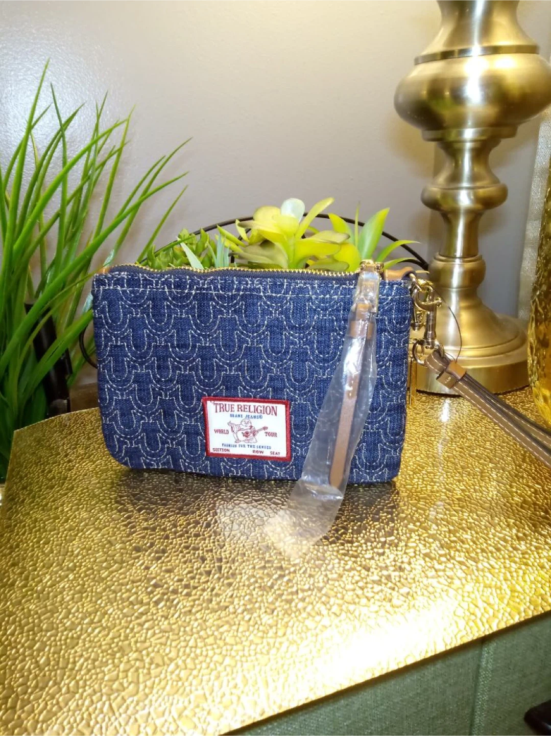 True Religion denim wristlet with a tan leather accent stripe. It's in great condition and ready for a new home!