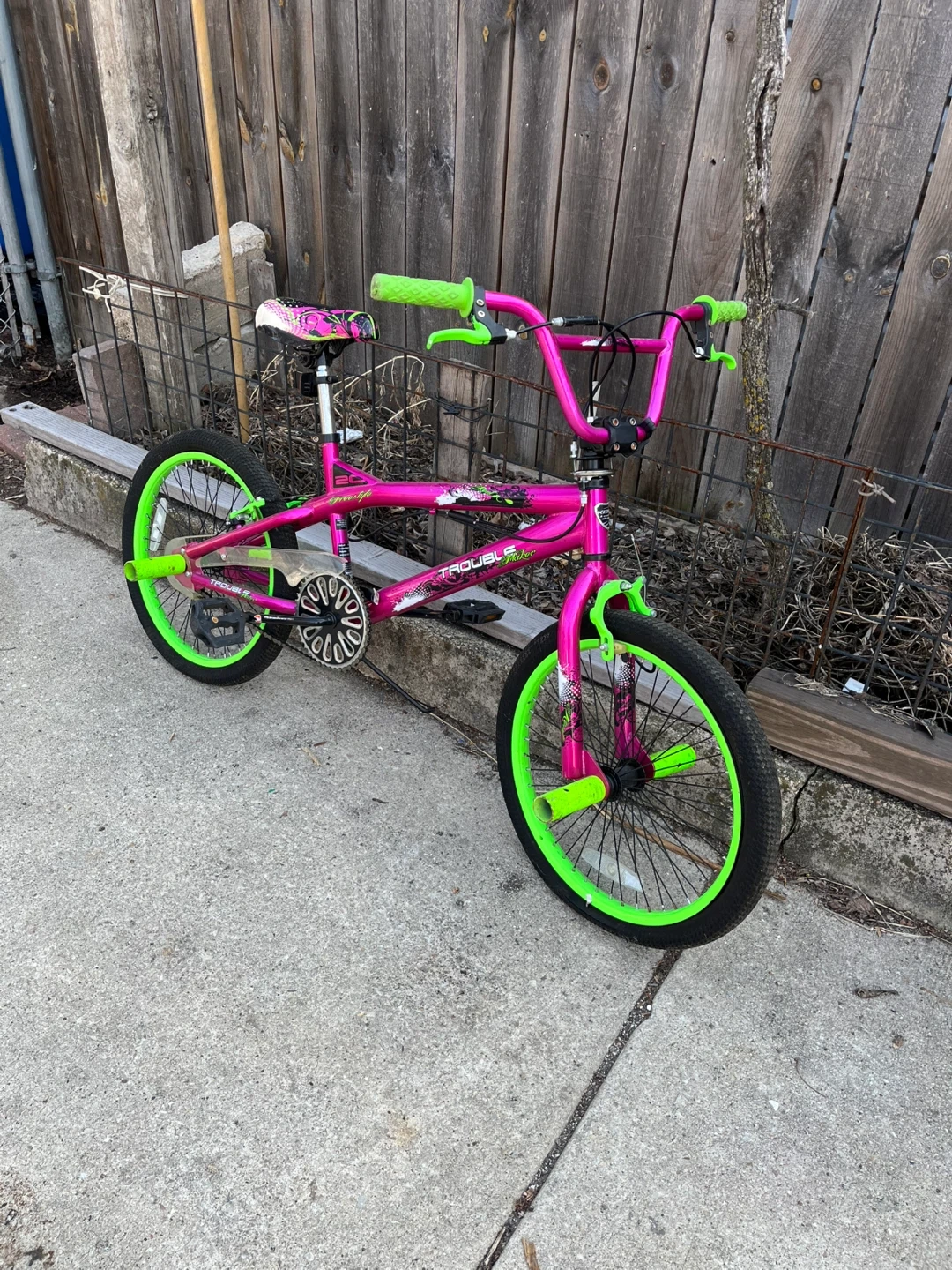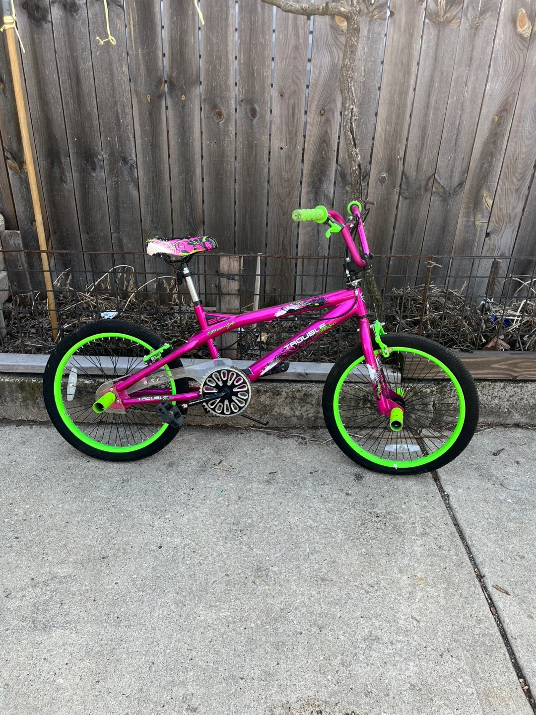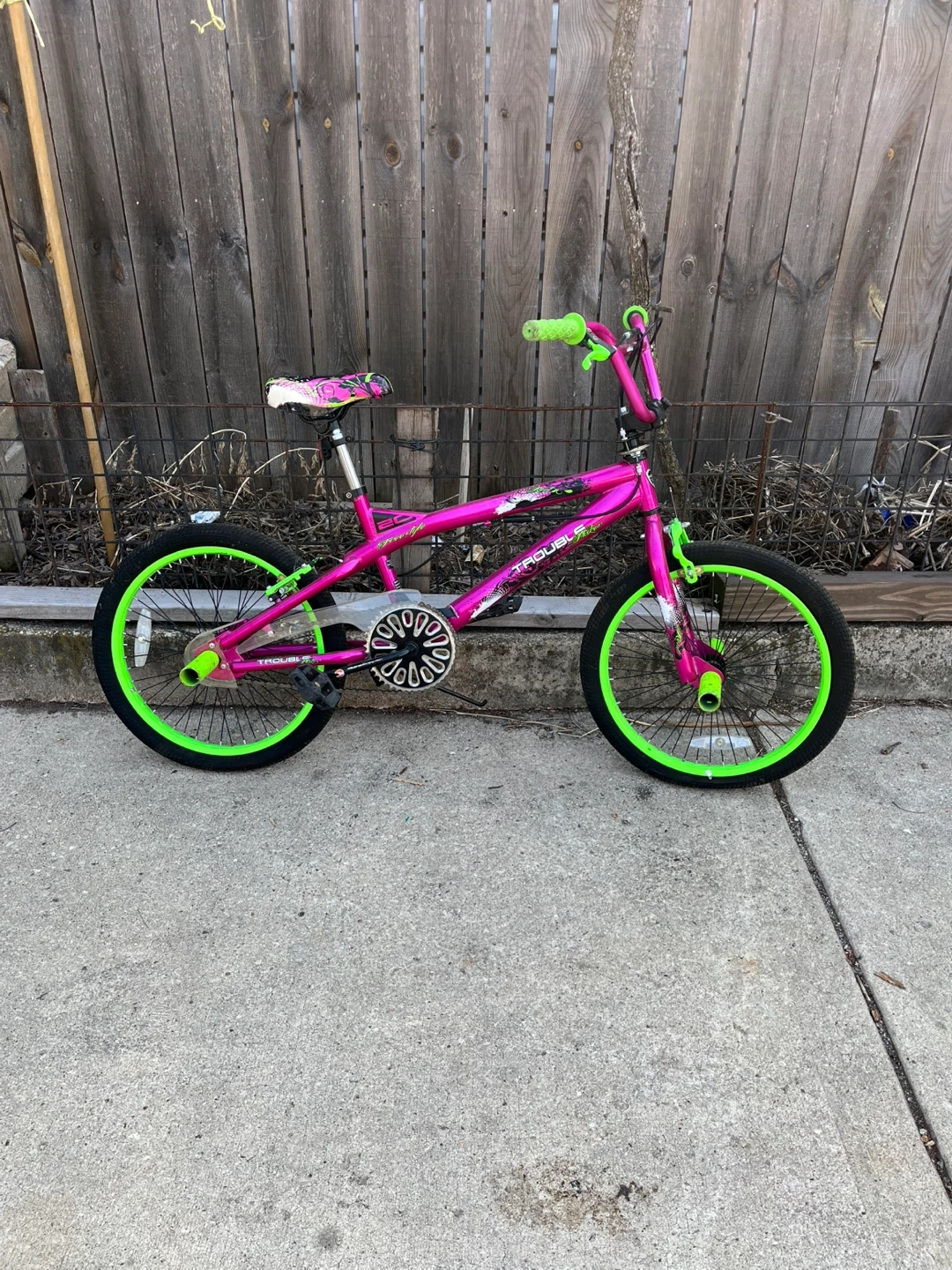 This is a pink and green Trouble BMX bike. It has a durable frame and bright neon green accents.