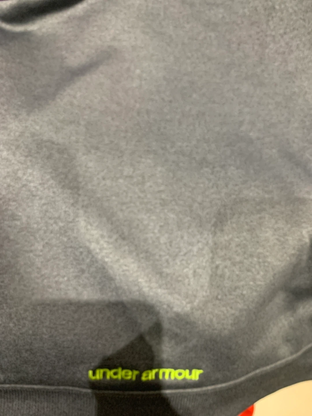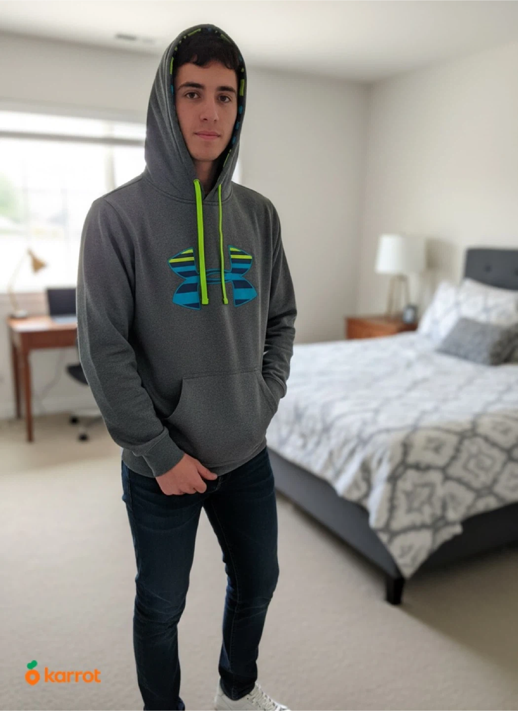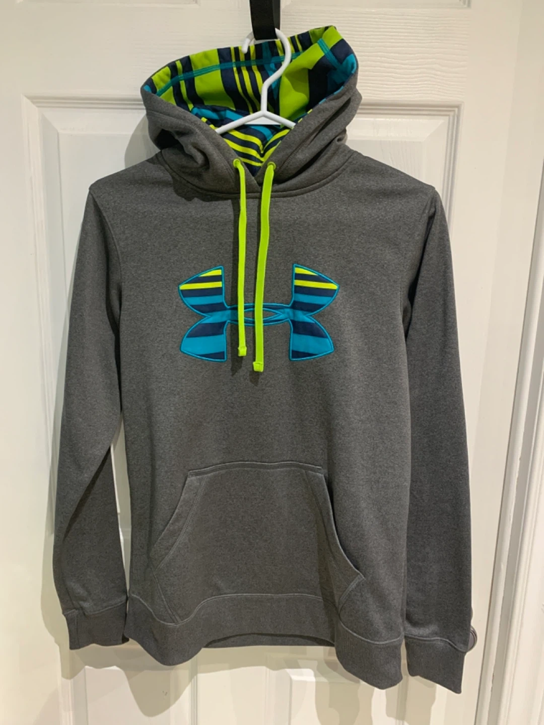 This is an Under Armour hoodie in grey. It's a size SM/P. The inside lining of the hood has a colourful striped pattern. It's made of a soft material.