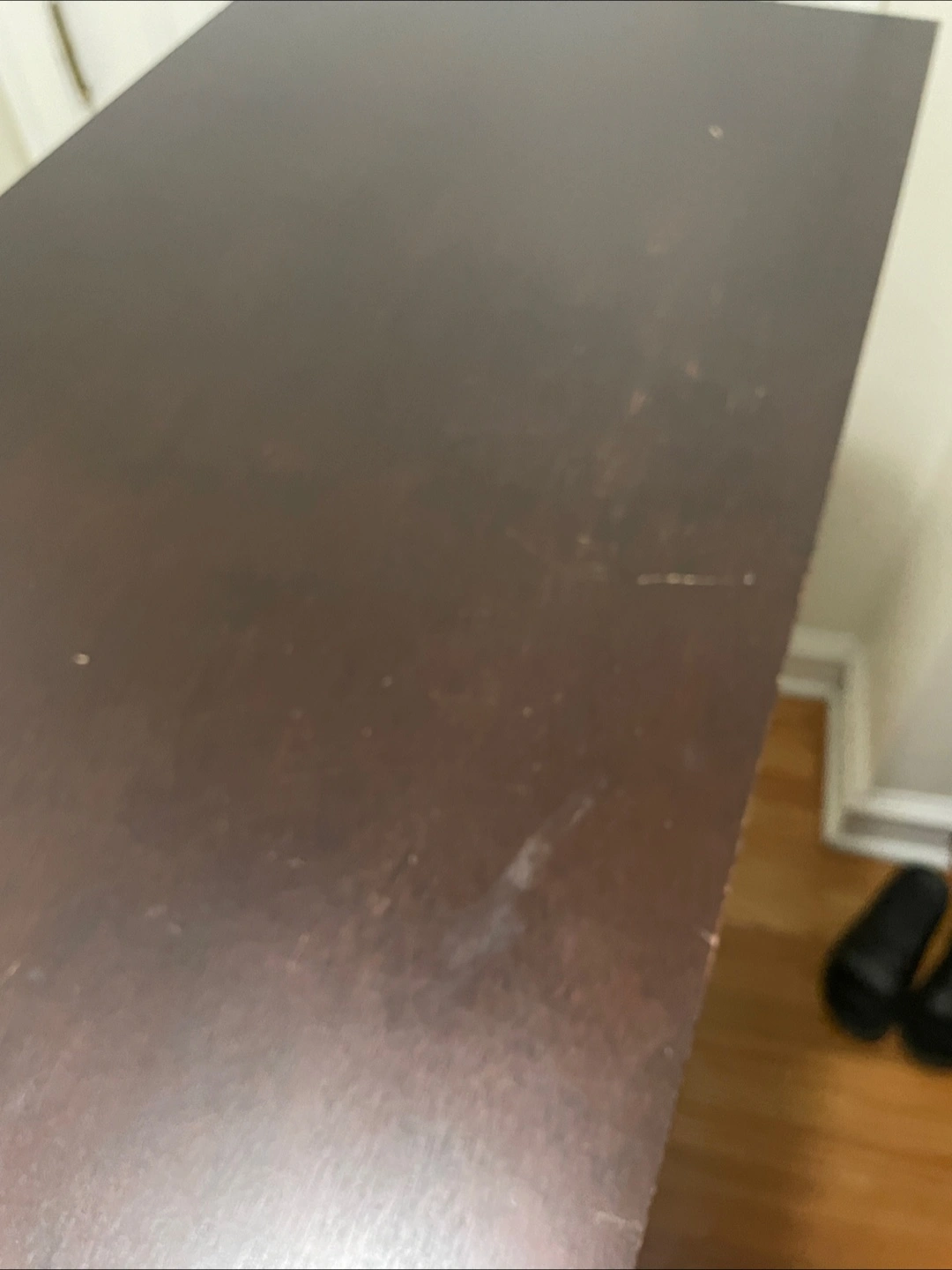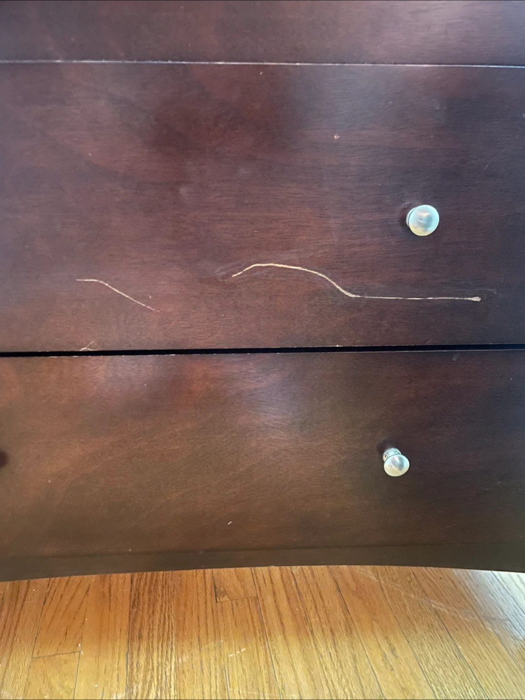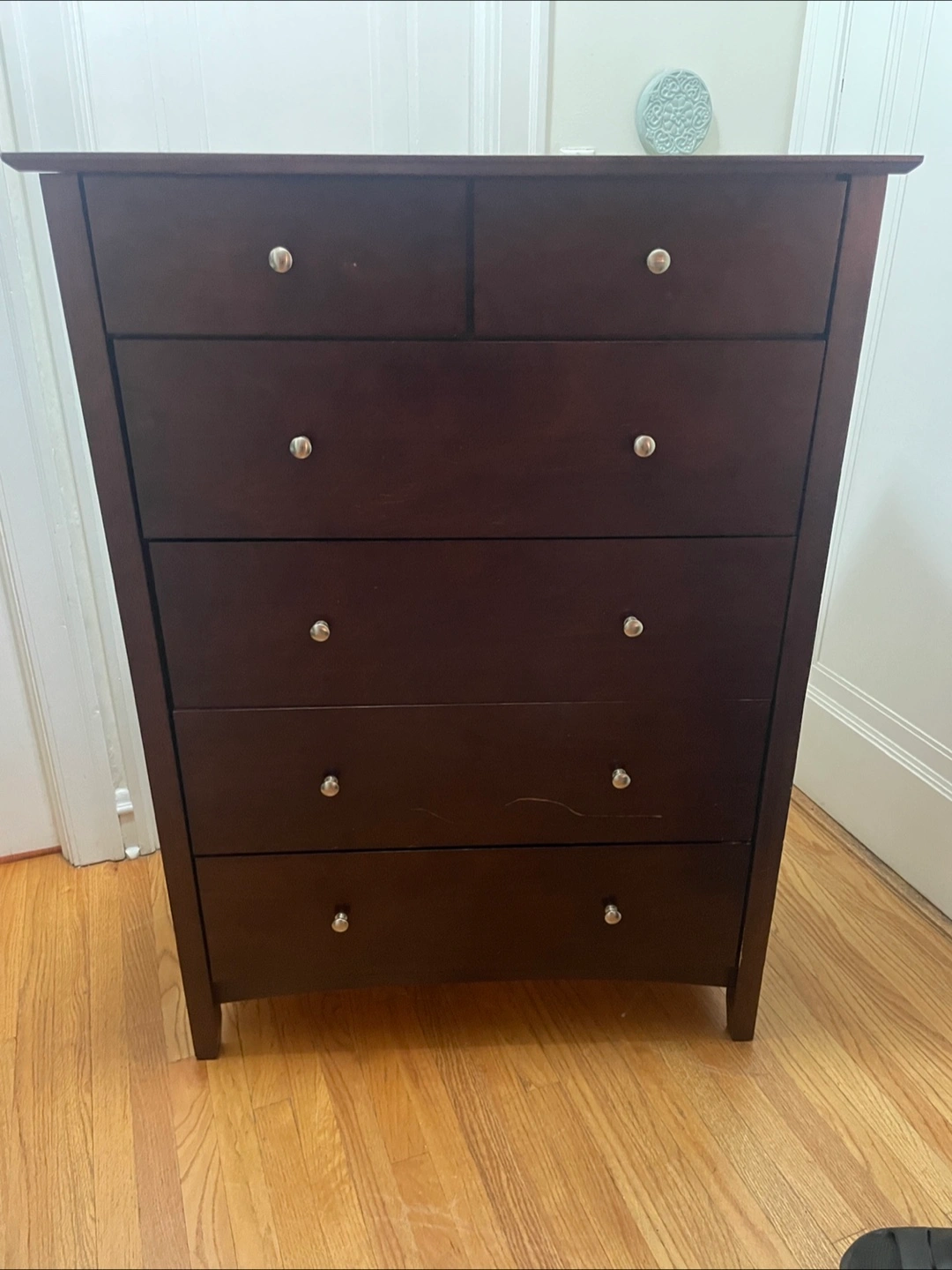 Selling a dark wood dresser with six drawers. It's in good condition and would be great for a bedroom or closet. The dresser has a clean and simple design that will fit in with any decor. There are a few scratches on the top, and one on a drawer. One drawer needs a new track. It’s not the style we want and don’t have energy to fix it.