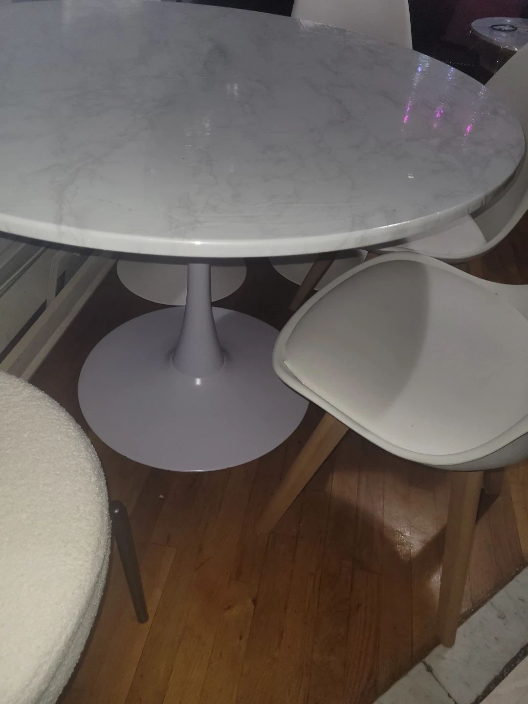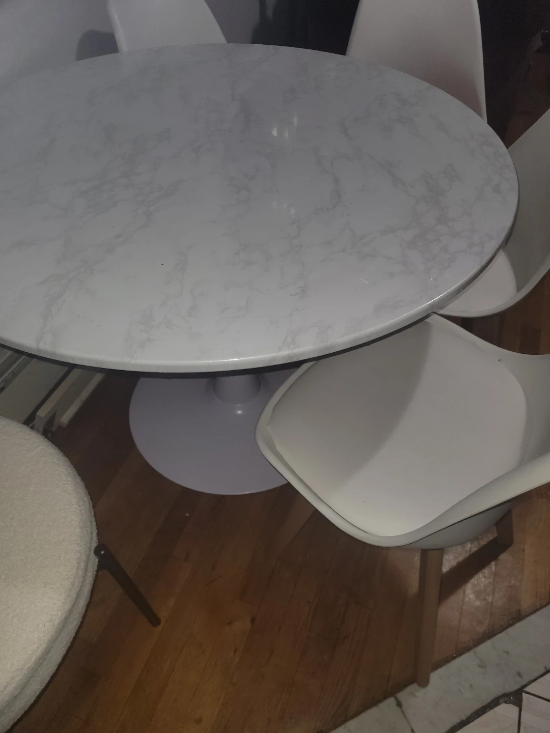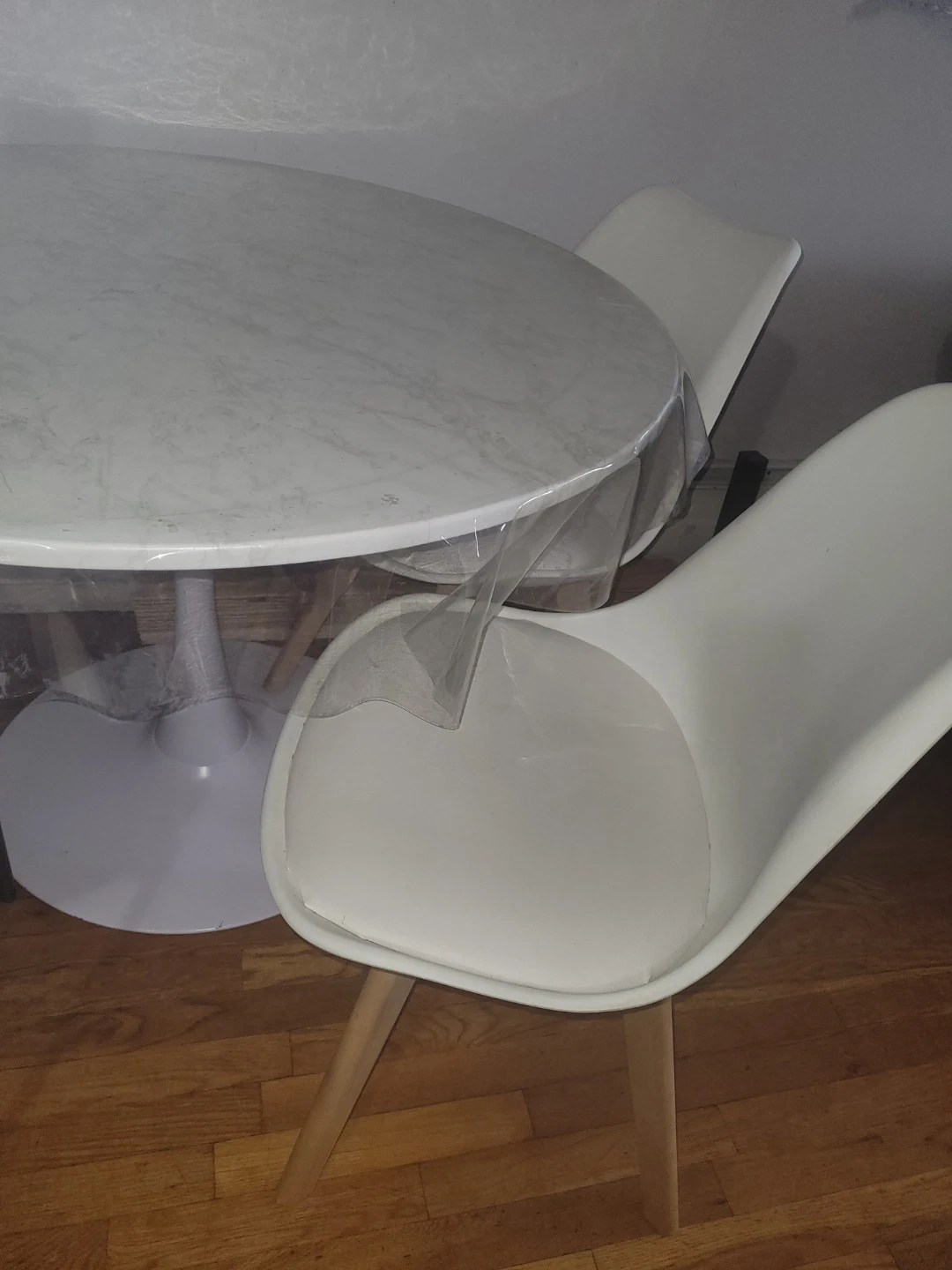 This is a white tulip-style dining table with a marble-look top. It comes with four matching white chairs with wooden legs. The table has a protective plastic cover on it. It's a nice set for a kitchen or dining area!