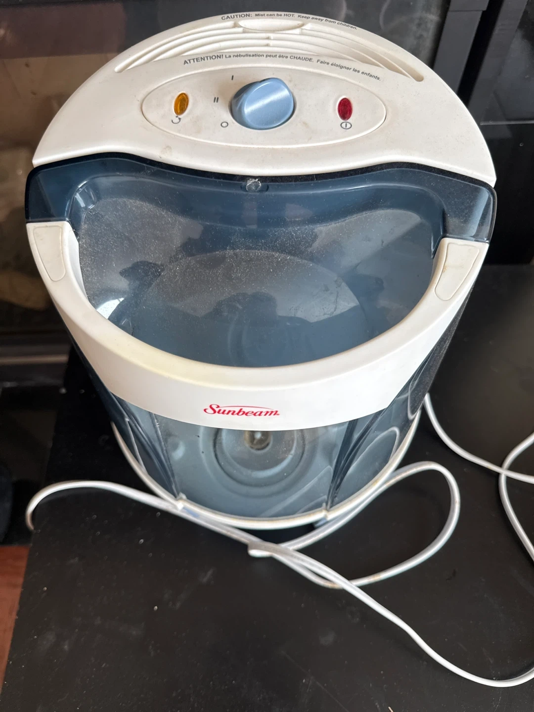 This Sunbeam vaporizer is in good working condition. It's a white and blue unit with a clear water tank. The power cord is included.