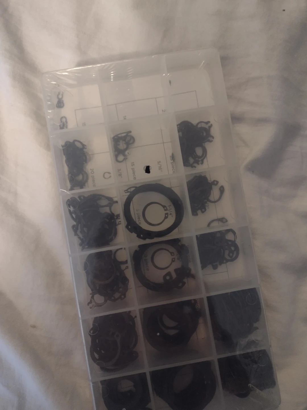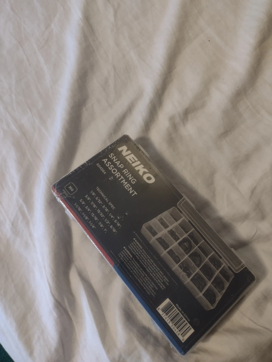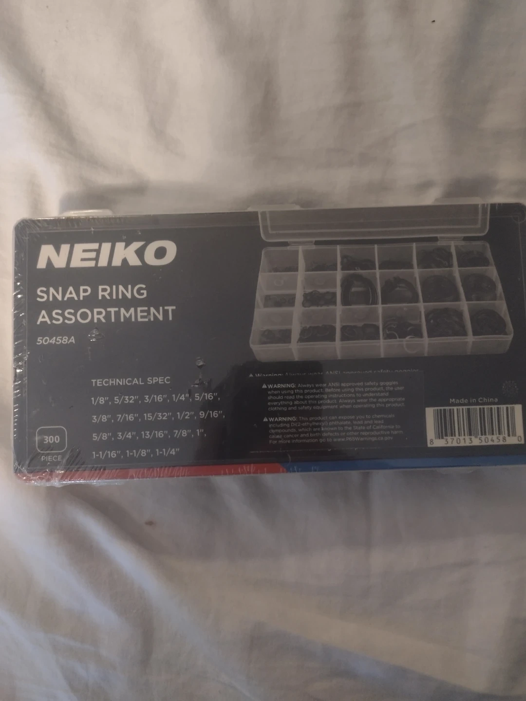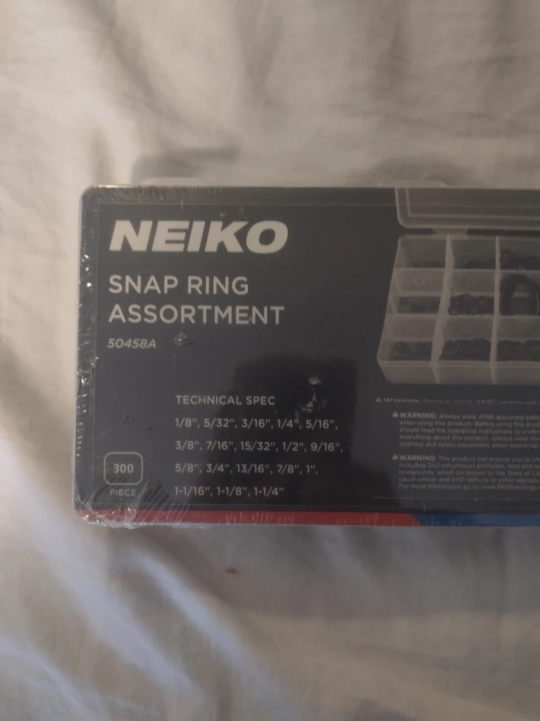 This is a NEIKO snap ring assortment kit featuring 300 pieces. Technical specs include sizes from 1/8" to 1-1/4". It comes organized in a clear compartment case for easy access. This assortment is useful for various mechanical repairs and projects.