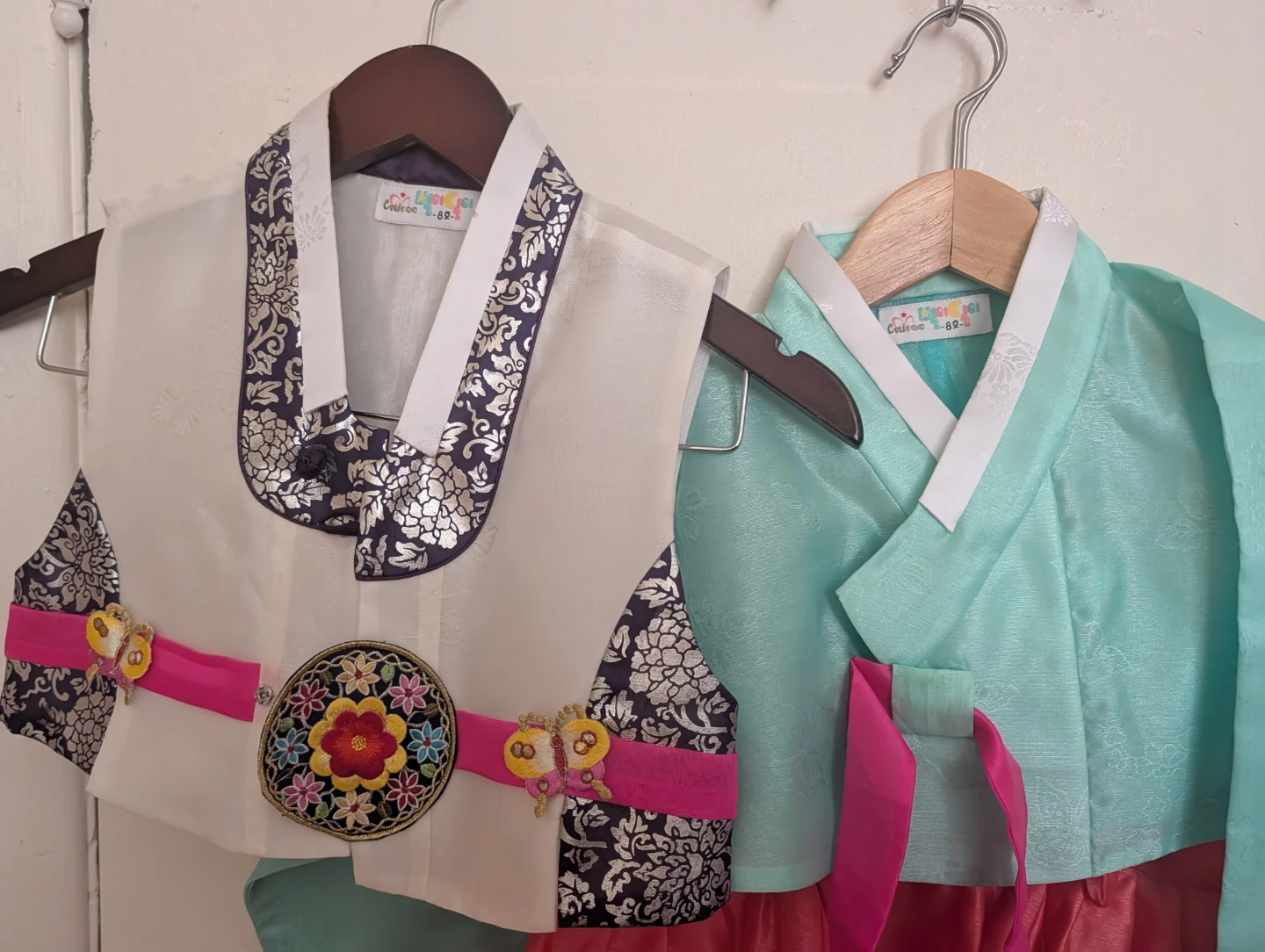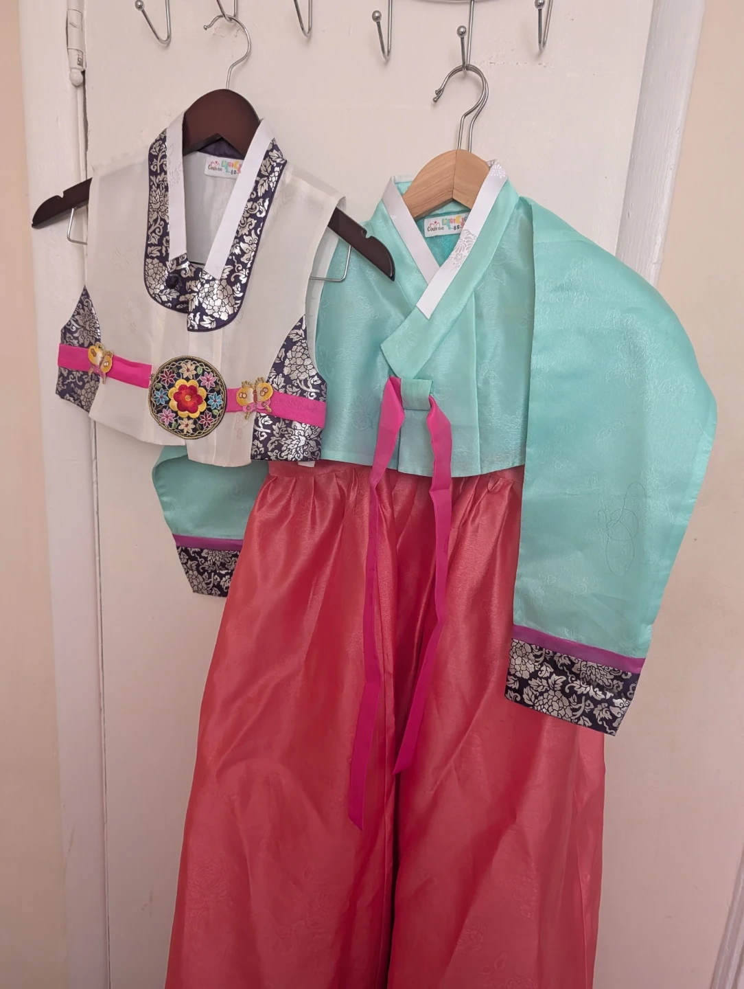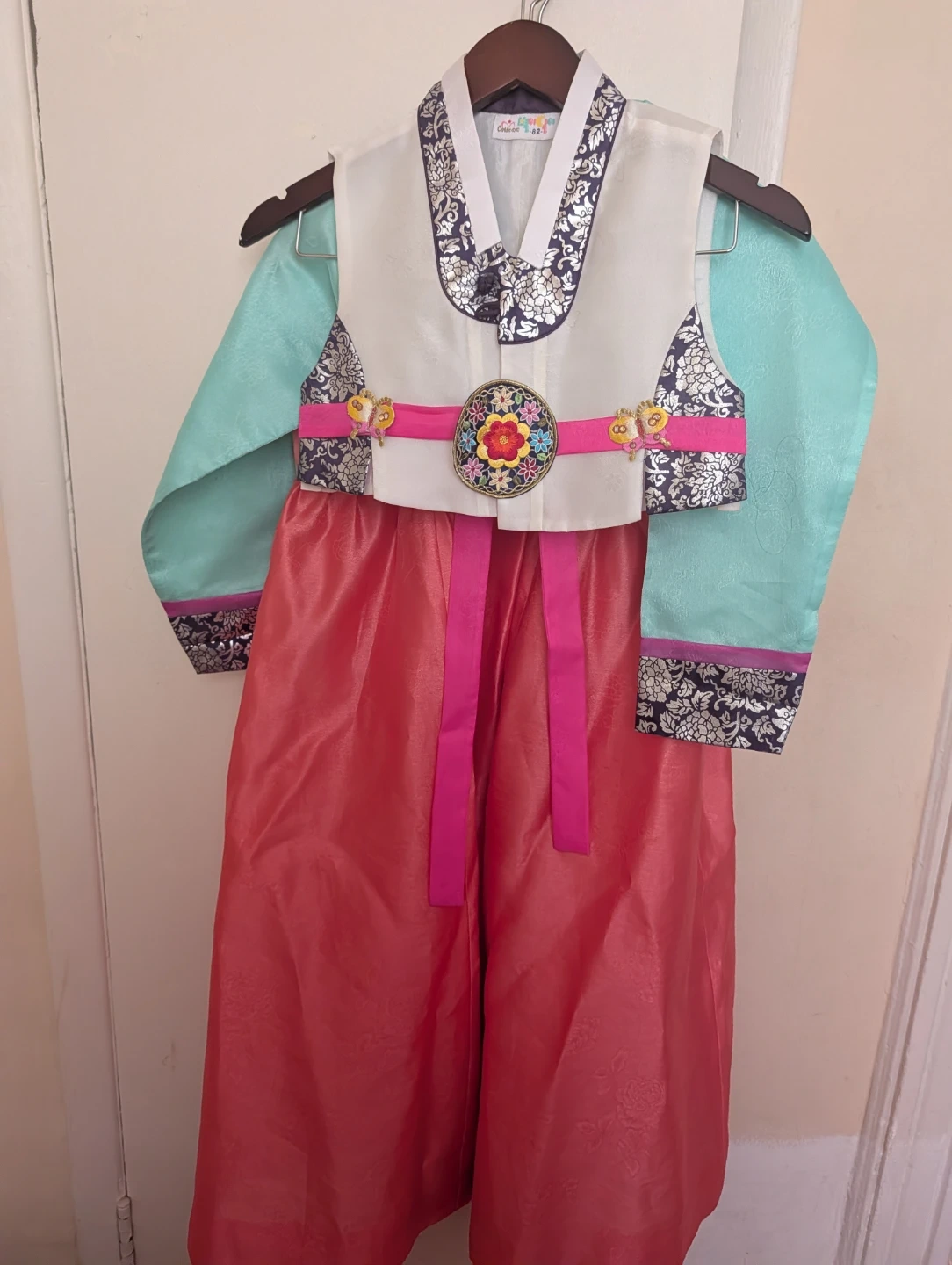 This is a beautiful traditional Korean dress, also known as a Hanbok, for children. It features a cream-colored vest with intricate floral embroidery and a vibrant pink skirt. The sleeves are a lovely aqua color with matching embroidered cuffs. It's perfect for cultural events or special occasions!