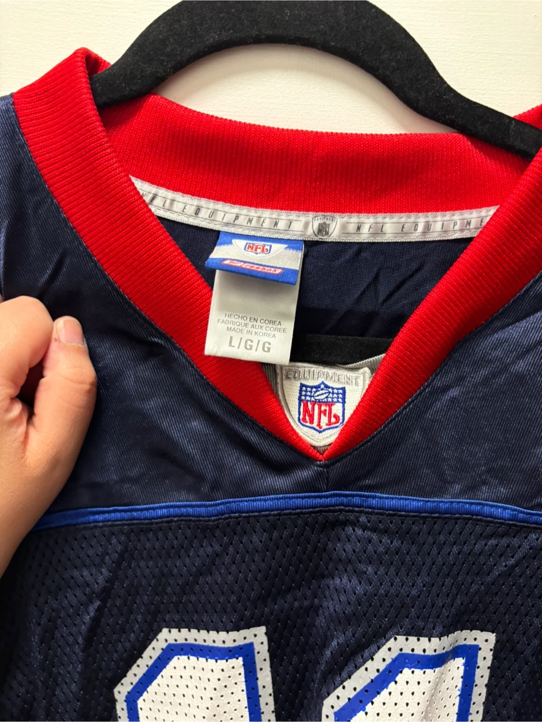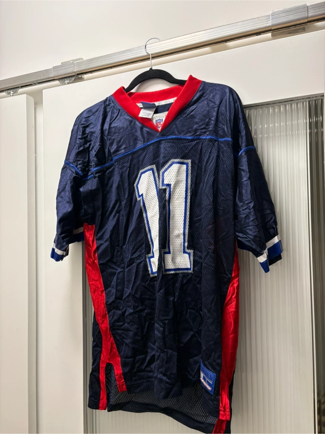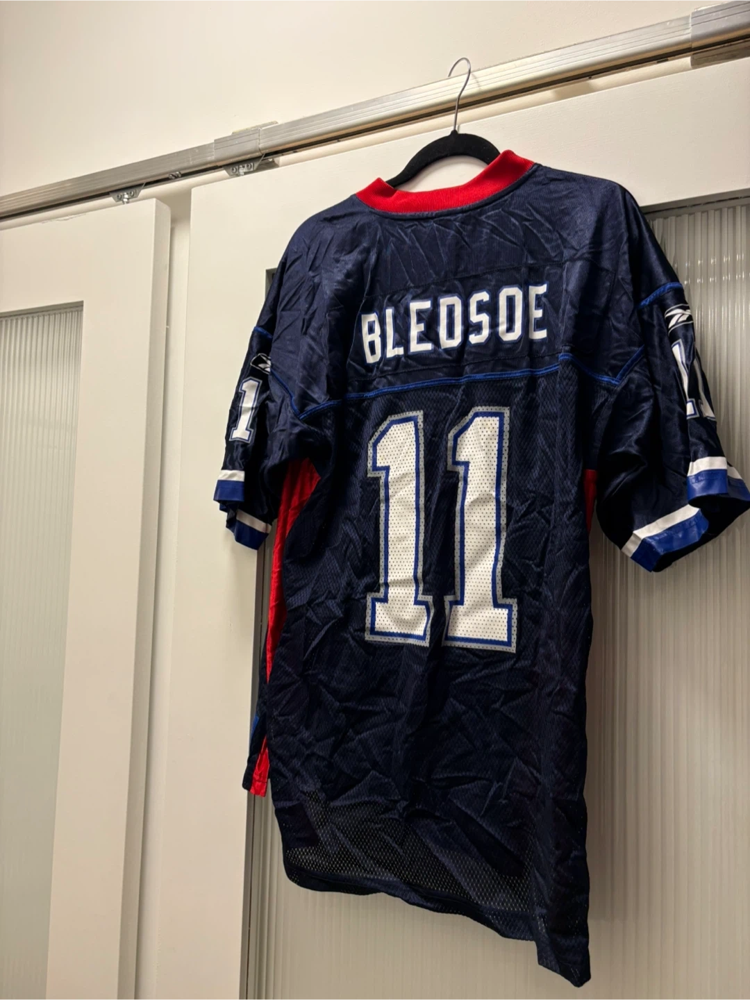 Classic navy design with red collar and side panels, featuring #11 on front and back with “Bledsoe,” representing Drew Bledsoe, one of the franchise’s most important quarterbacks of the 1990s and early 2000s.
