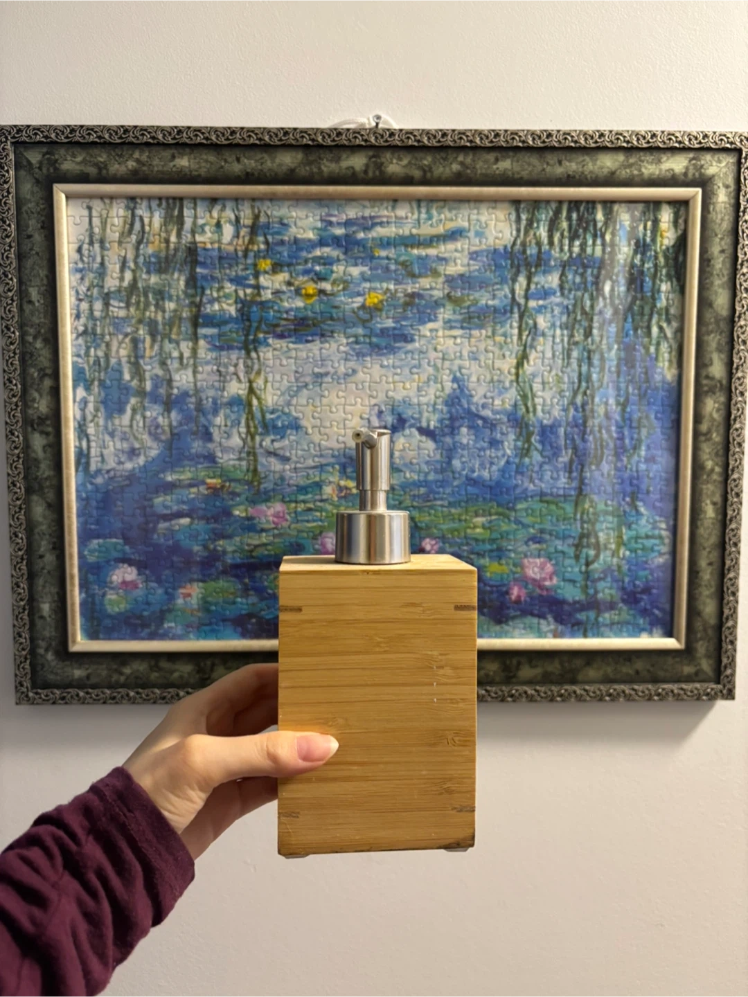 A stylish soap dispenser with a bamboo casing and a stainless steel pump. Its natural wood finish adds a warm touch to any bathroom or kitchen counter. It's perfect for liquid soap, lotion, or dish soap.