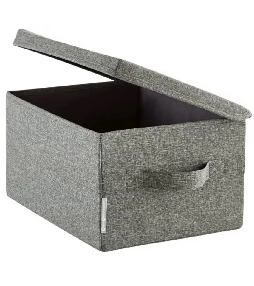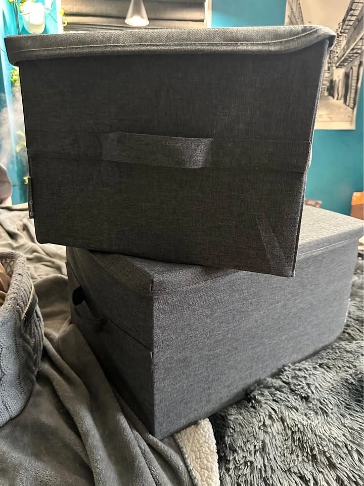 Two storage boxes from The Container Store. One was opened but never used, and the other is gently used. They are made of cardboard covered in fabric with handles. Dimensions are shown in the pictures.