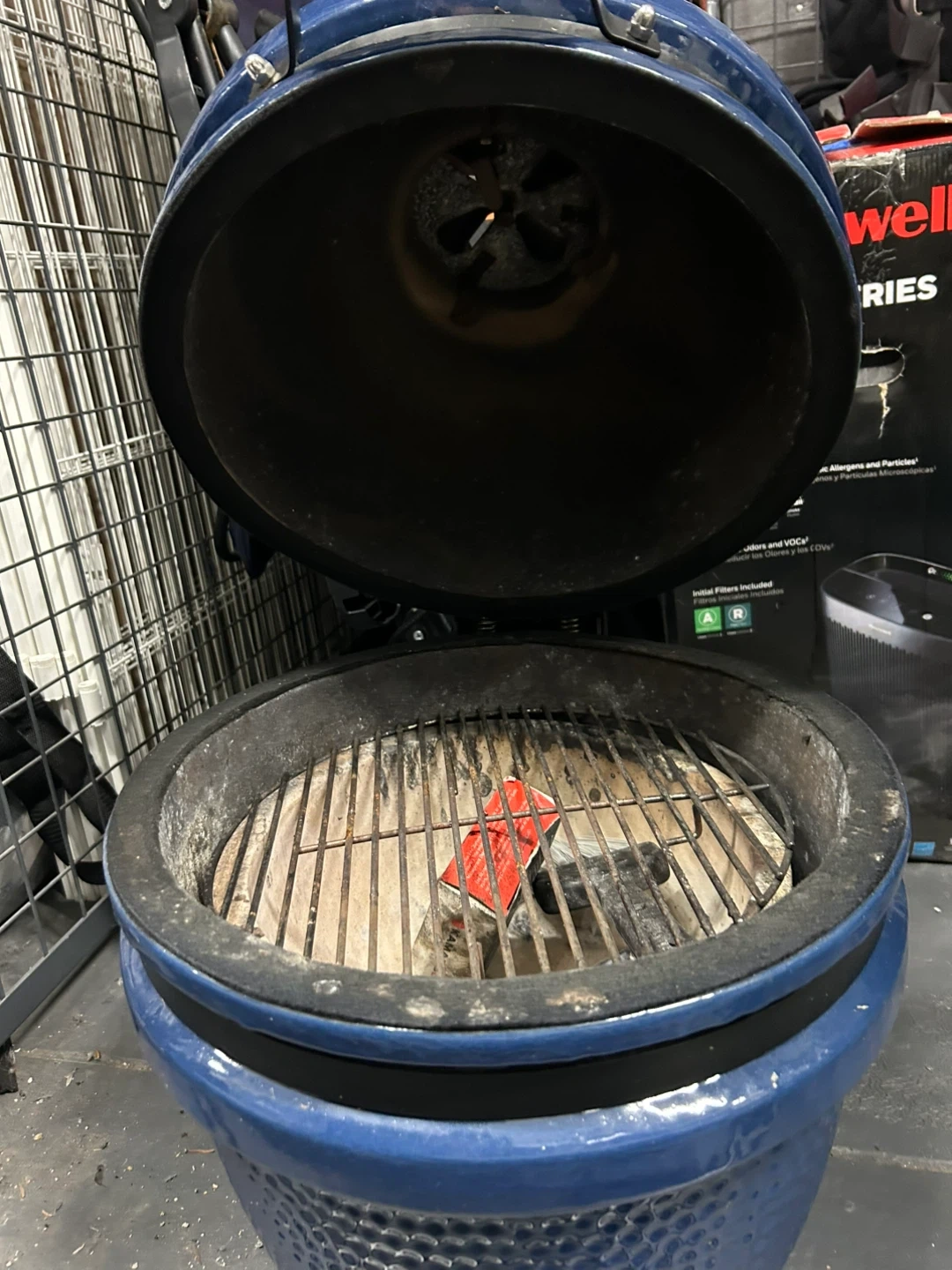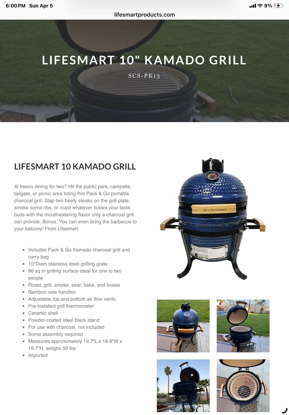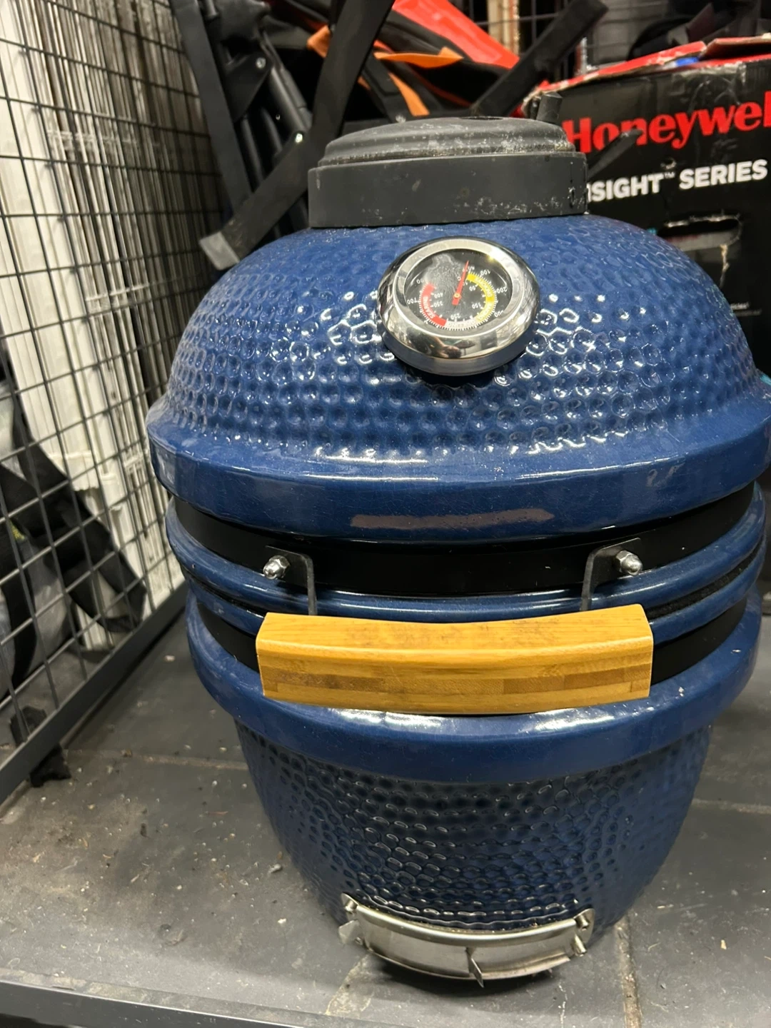 Lifesmart 10 inch Kamado Grill in blue. It's perfect for grilling, smoking, searing, and baking. Includes a 10" diam stainless steel grilling grate and a cover. Measures approximately 19.7"L x 18.9"W x 19.7"H and weighs 50 lbs. Barely used. Bought it for a summer rental a few years ago. Been sitting covered in storage ever since then. Cost 169.new.