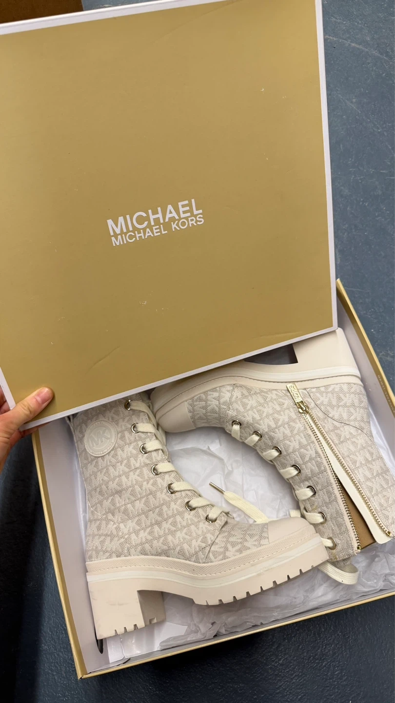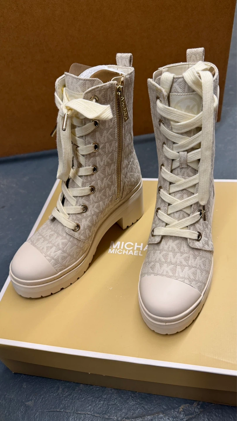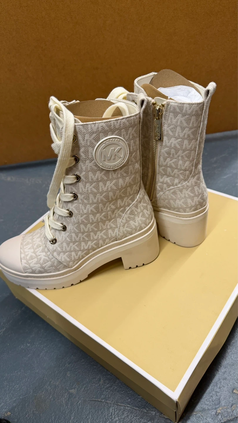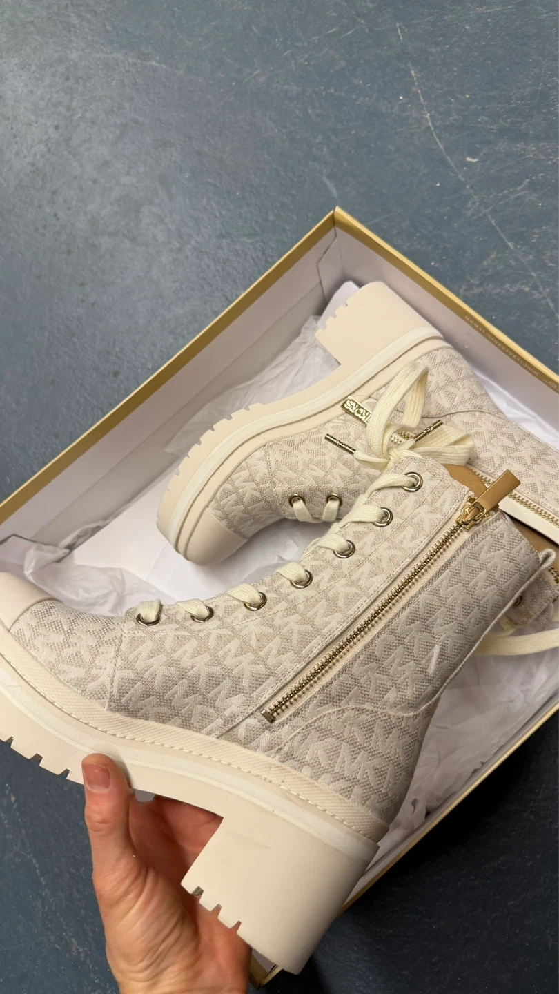 Cream canvas Michael Kors boots with allover MK logo print. Features side zip and lace-up closure with a lug sole. Includes original box. Size 5.5.