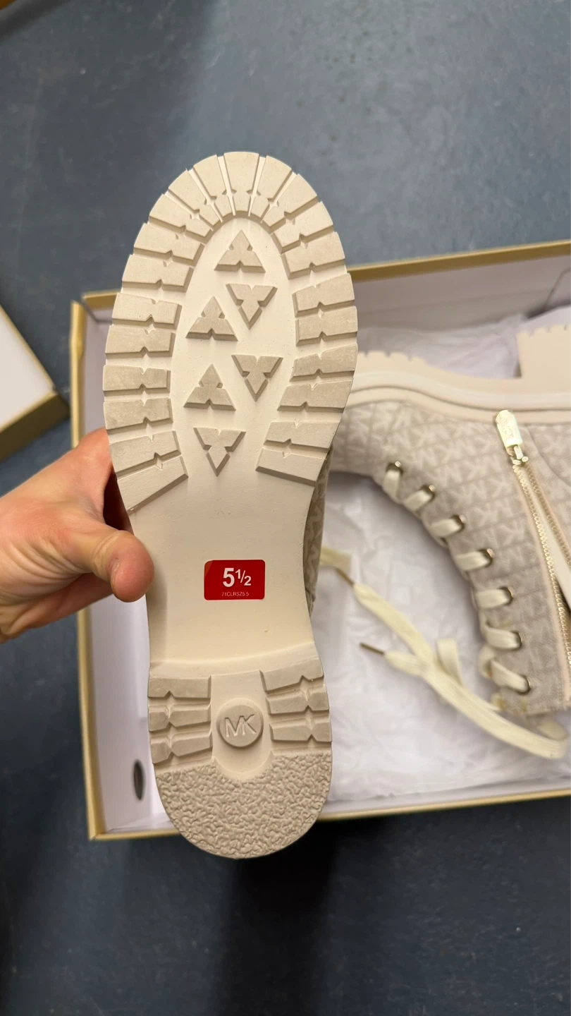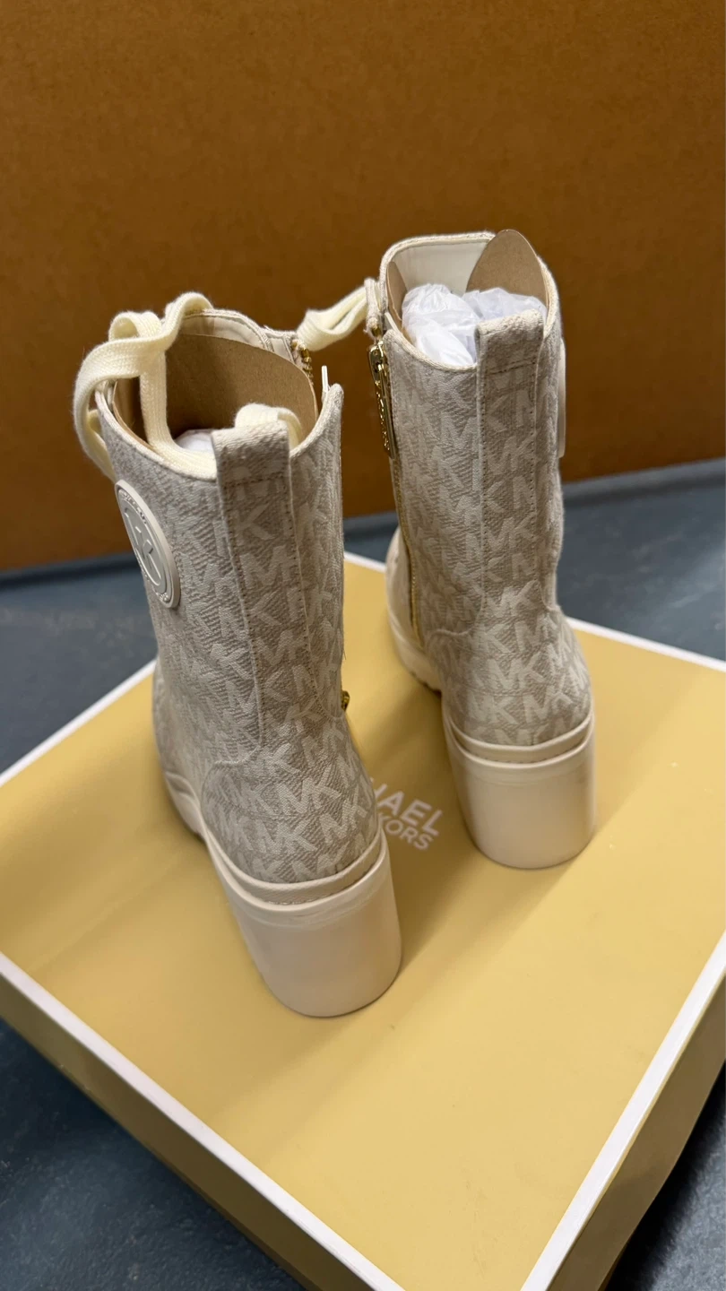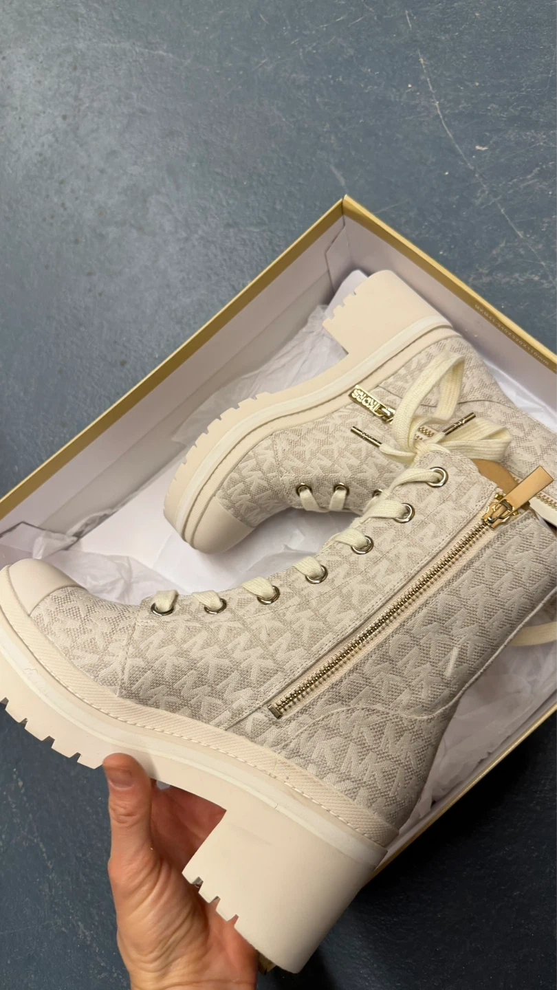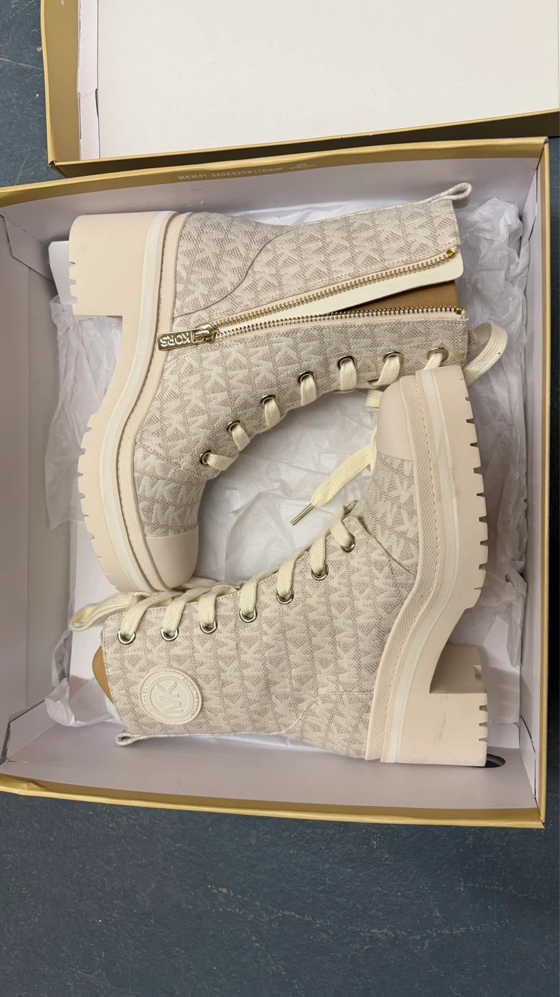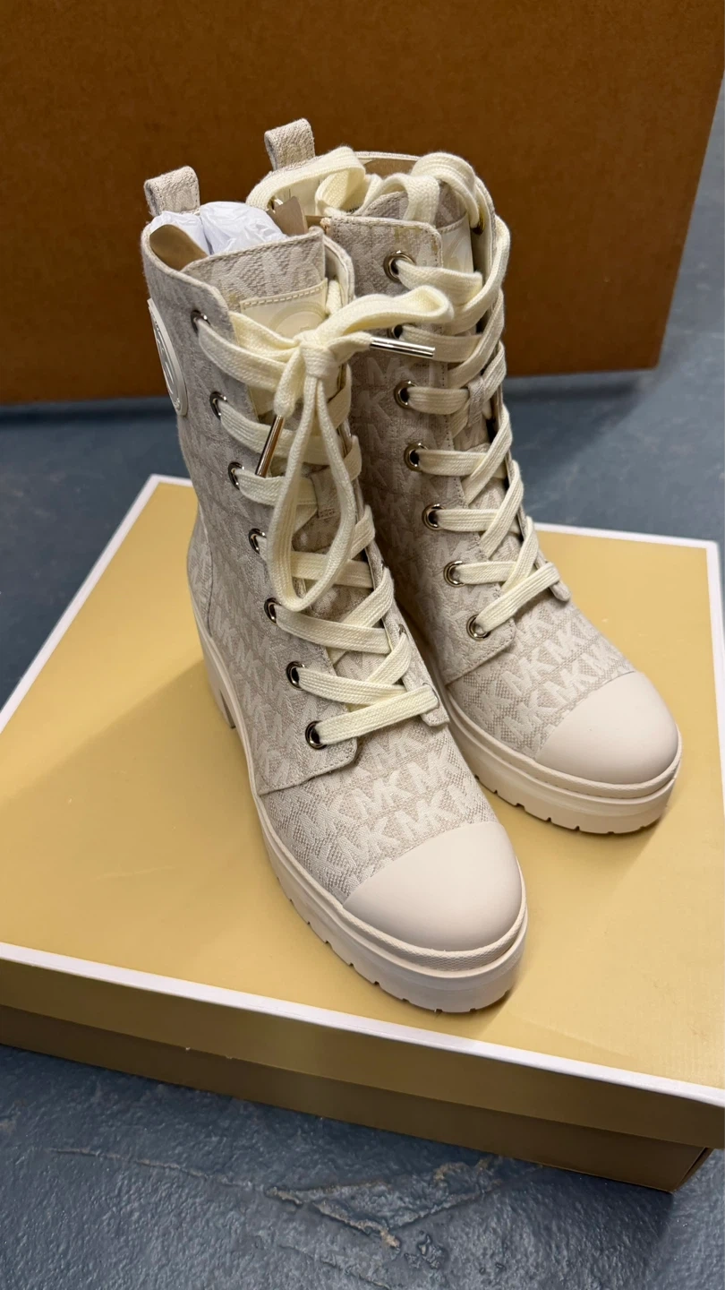 Cream canvas Michael Kors boots with allover MK logo print. Features side zip and lace-up closure with a lug sole. Includes original box. Size 5.5.