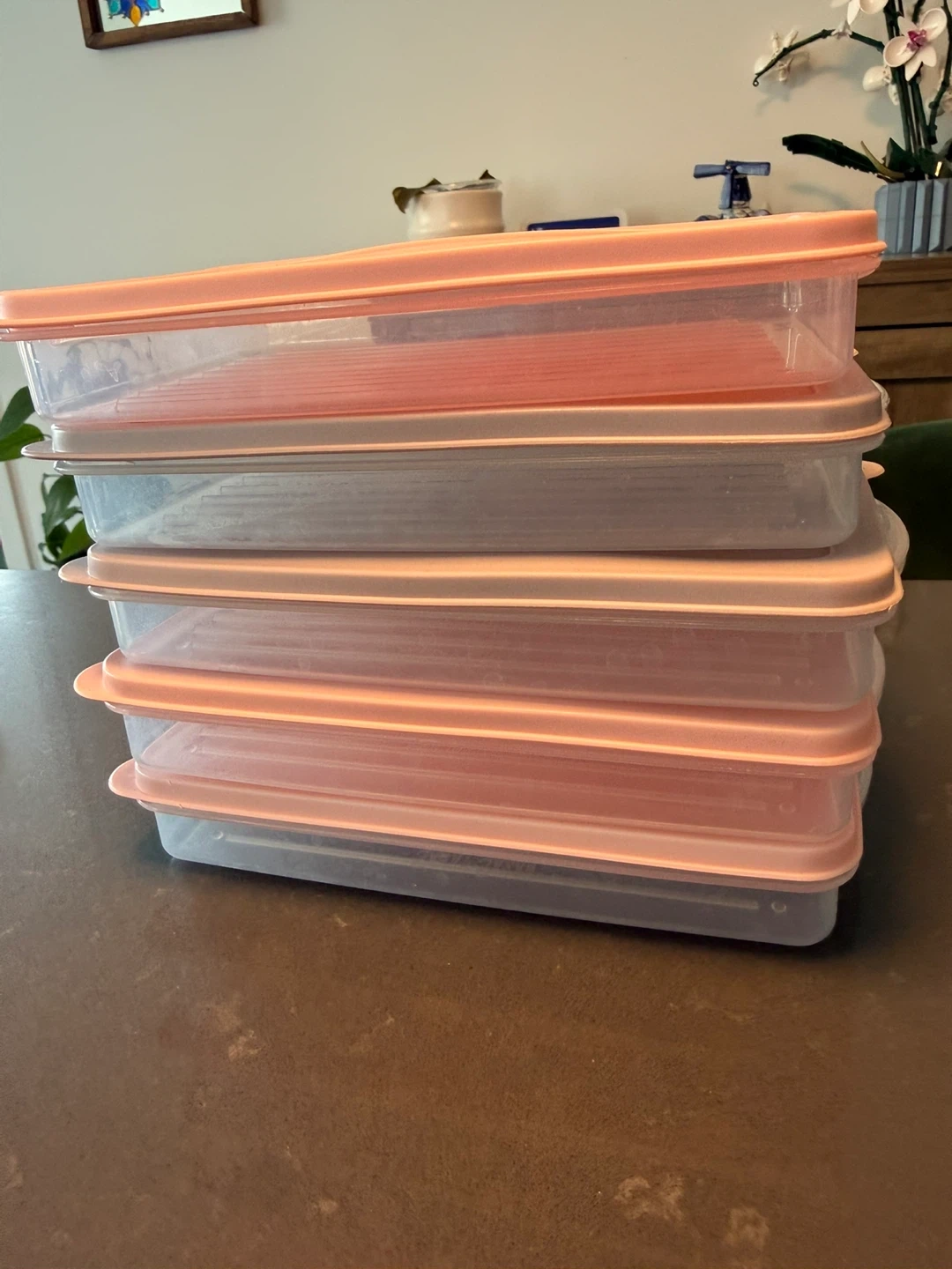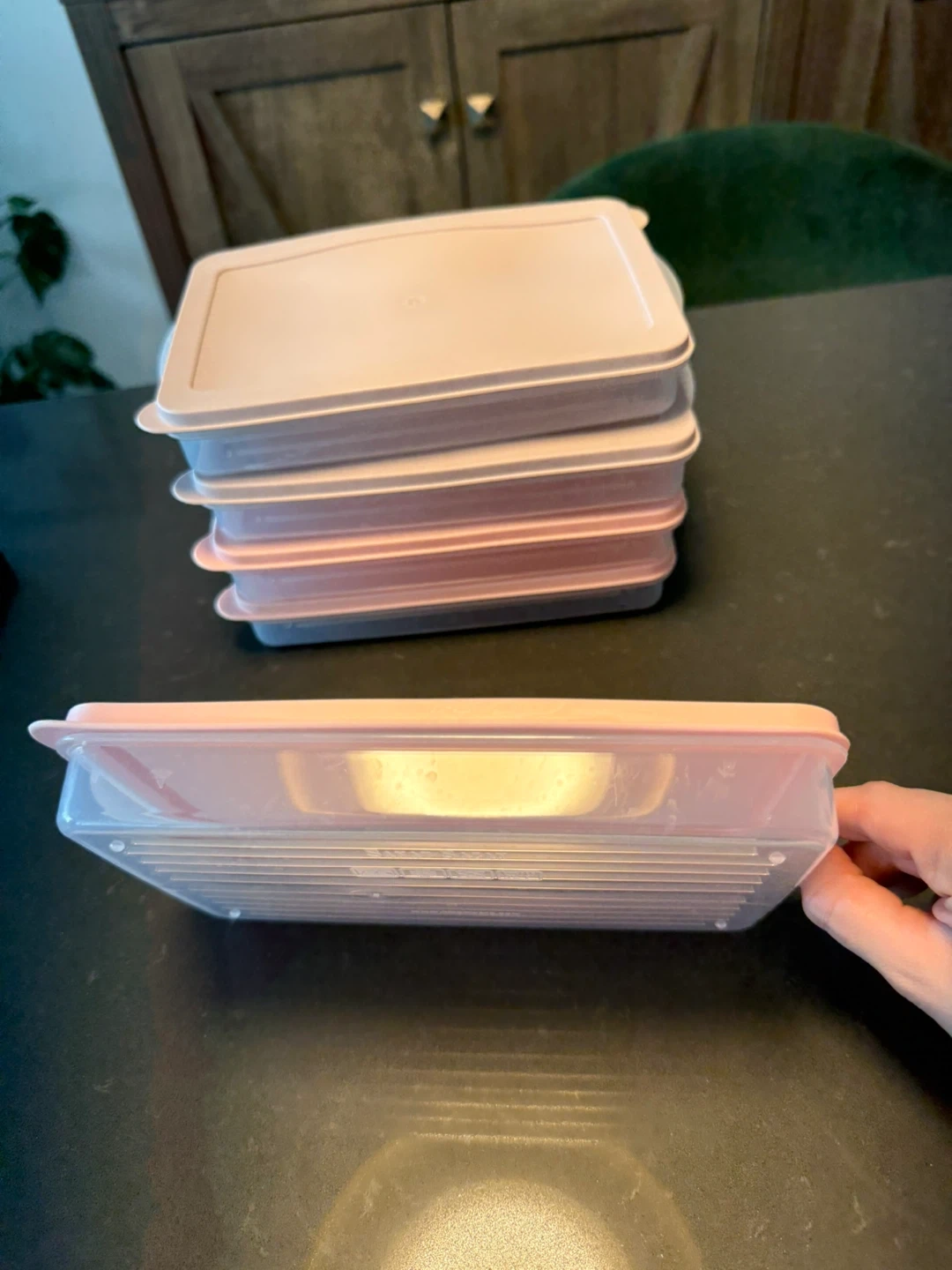 Set of six stackable food storage containers. Features clear bases with pink lids. Great for organizing your fridge or freezer. Convenient for meal prep or leftovers!