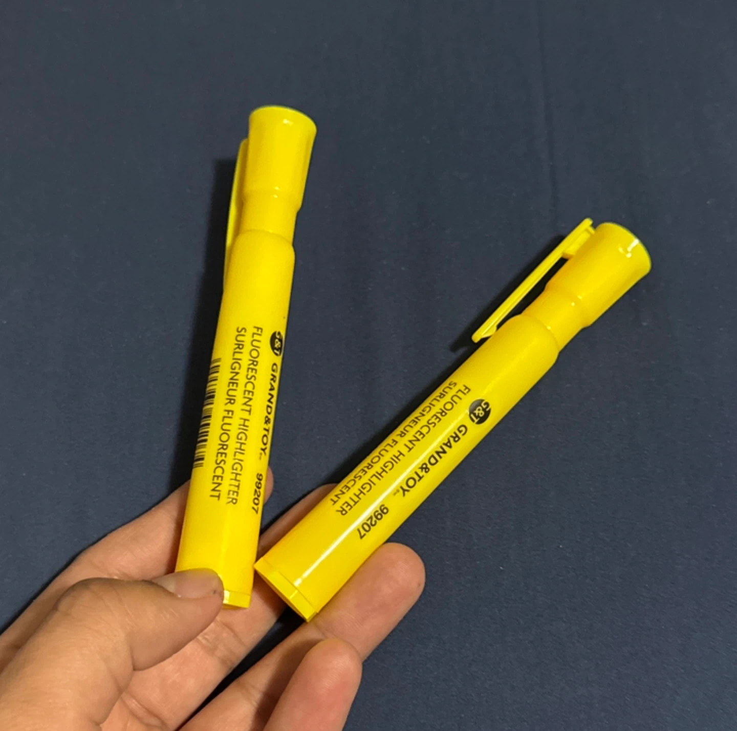 2 pc yellow GRAND & TOY fluorescent highlighters. These highlighters are perfect for marking important text in textbooks or documents. They're made for clear, vibrant highlighting!