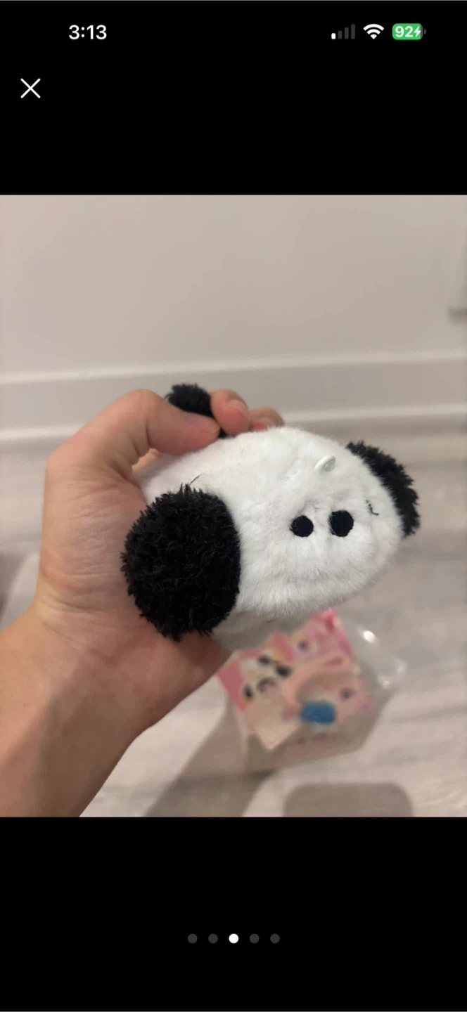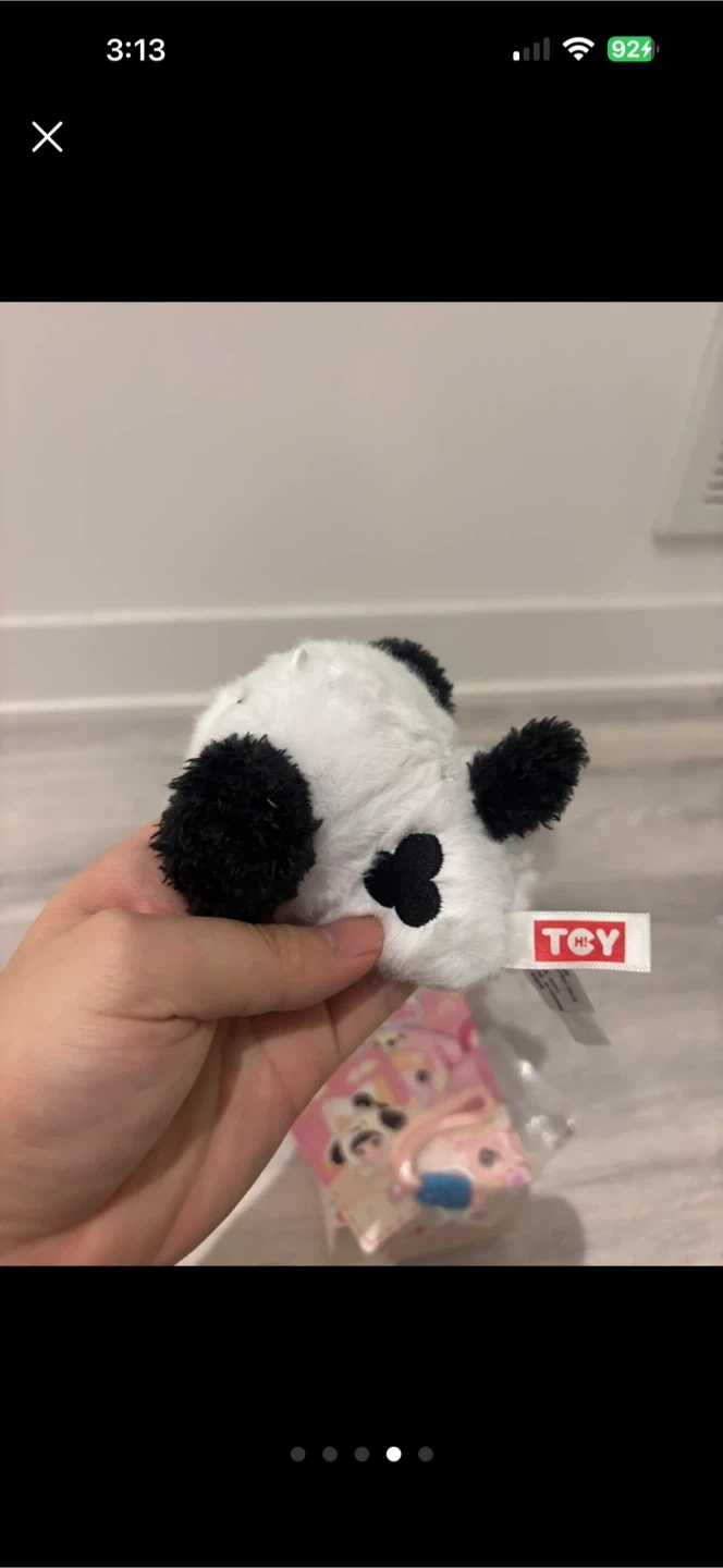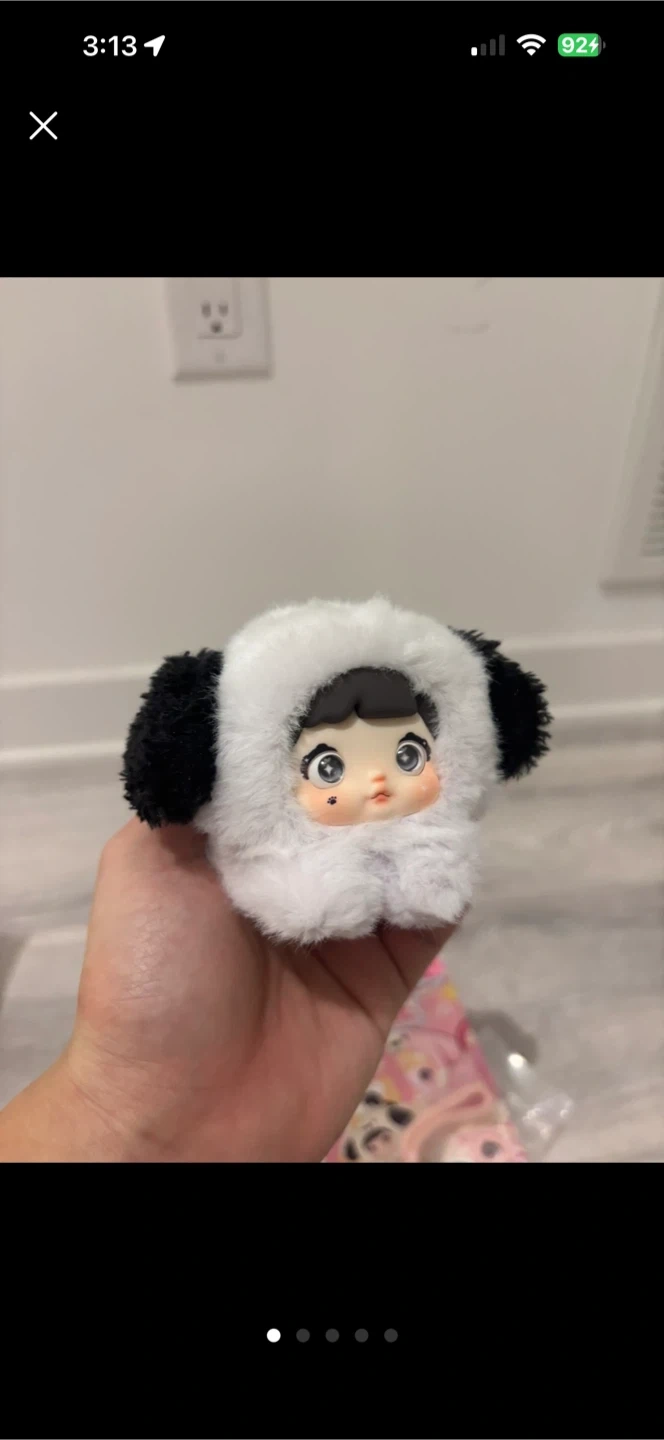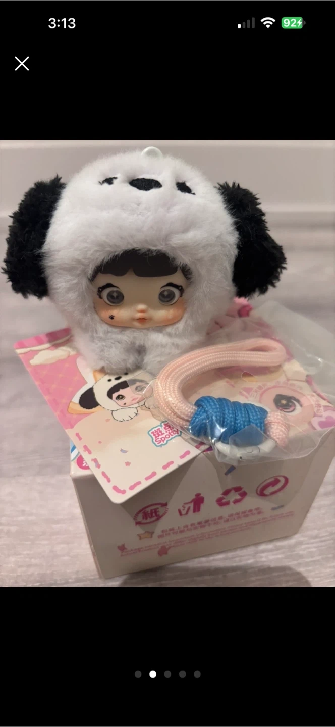 This is a blind box mini figure toy, featuring the 'Spooky Baby' design. It's a plush toy with a doll-like face and a fuzzy white and black panda-themed outfit. It includes a pink rope with blue string attachment, possibly for hanging. Comes in its original packaging.