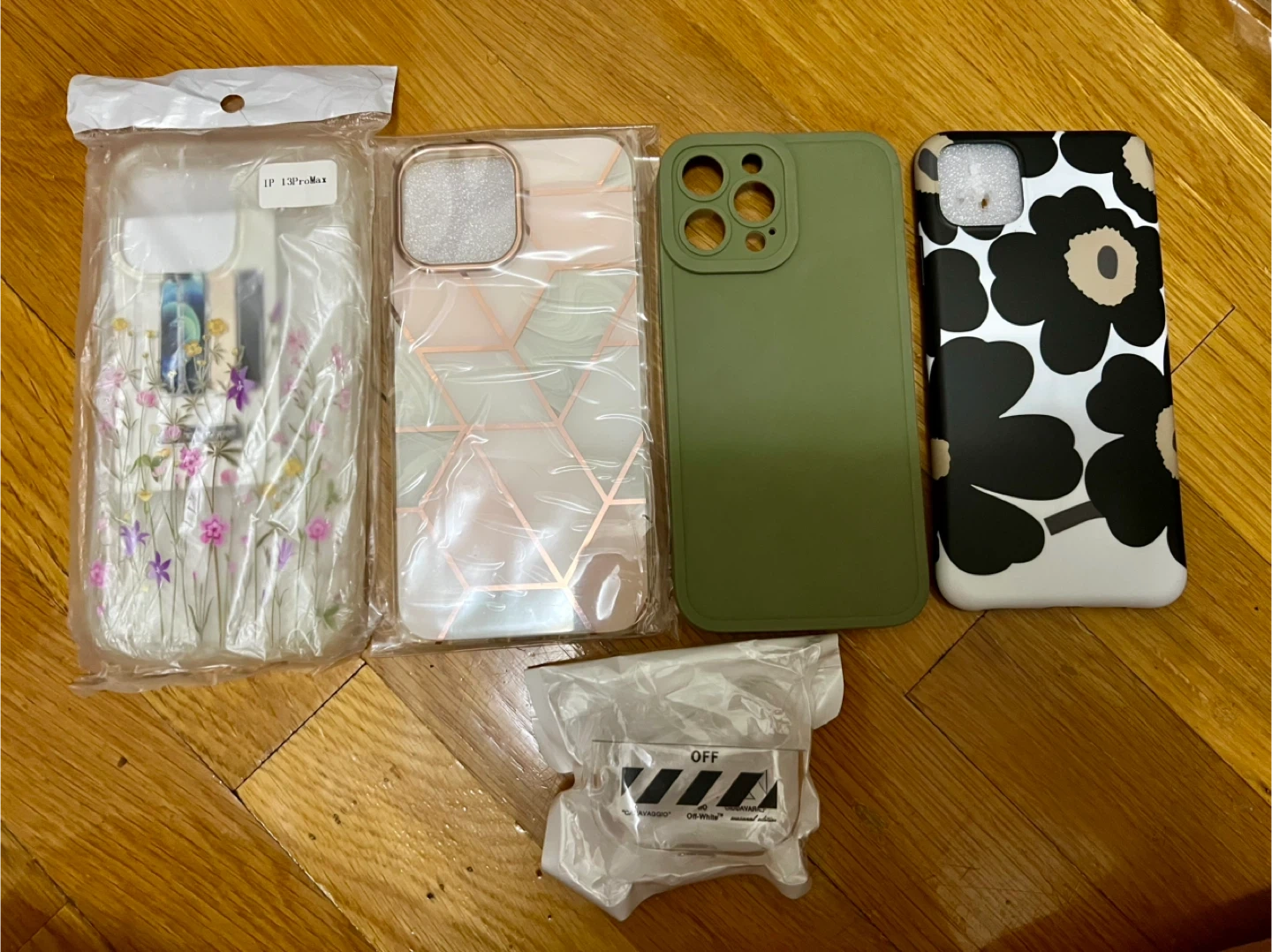 Free phone cases for an iPhone 12& 13 Pro Max. Includes a floral print case, a geometric marble print case, a solid olive green case, and a black and white floral print case. Also includes an Off-White 'OFF' tag accessory.