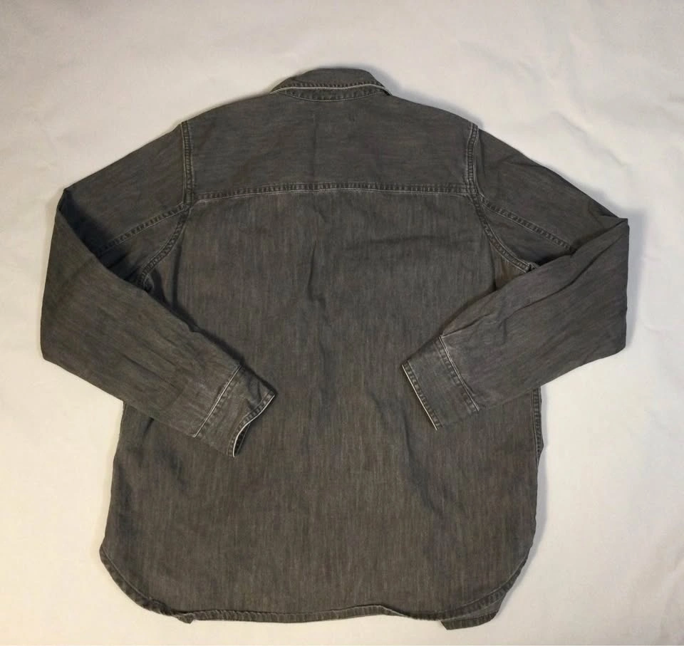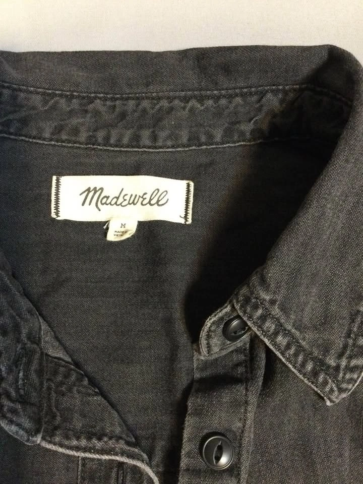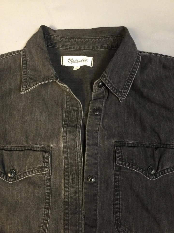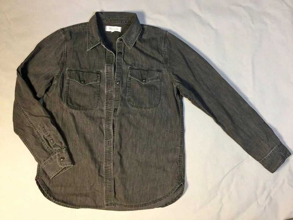 Comfy Madewell long sleeve button-up shirt. Has a cool dark gray washed denim look. Size M. Two chest pockets with buttons. Button cuffs and a curved hem. Cash only, public meetup in Manhattan / Hell's Kitchen.
