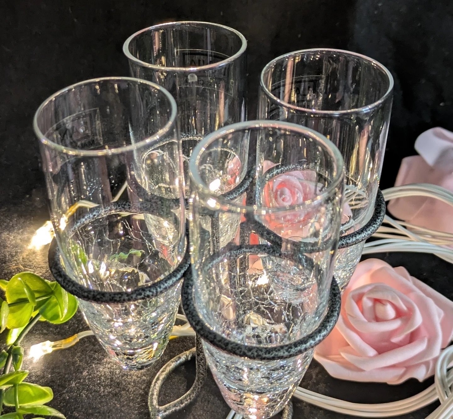 This set includes four unique shot glasses with a crackle glass design. They come in a metal holder, perfect for serving small drinks! Glasses are clear with a distinct crackle pattern.