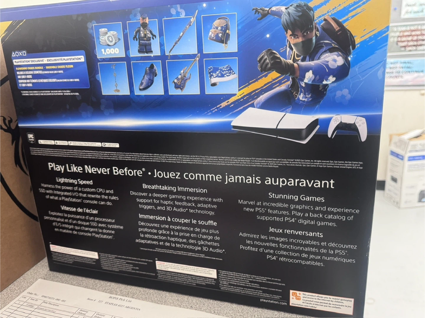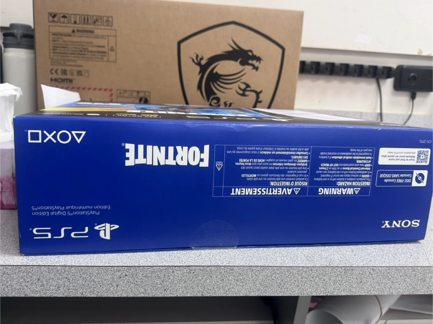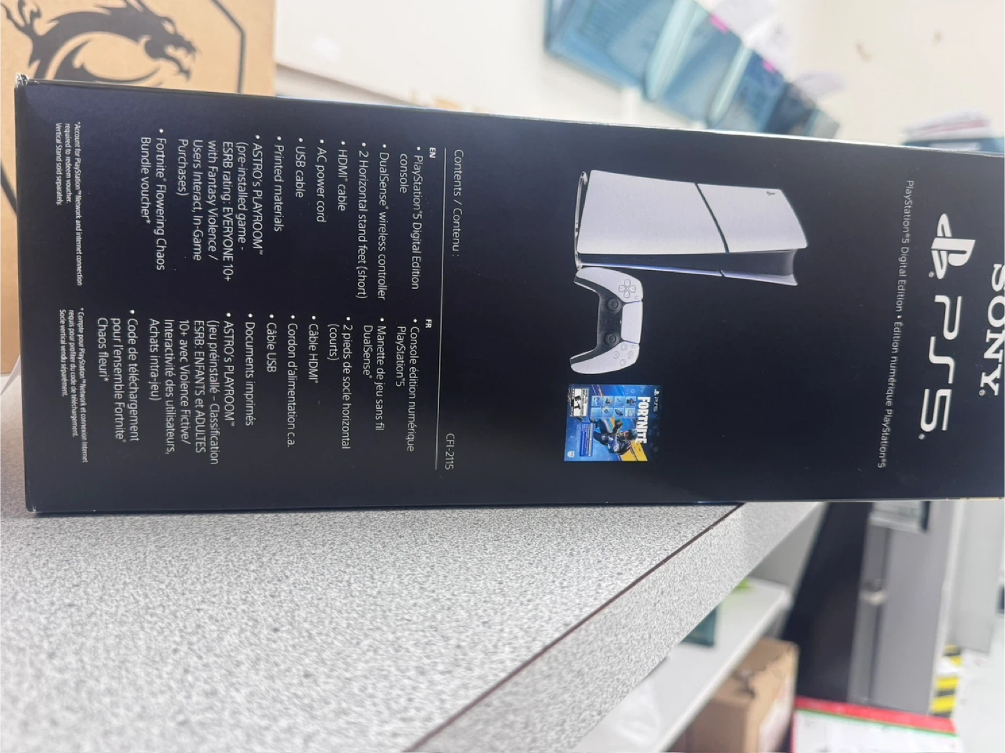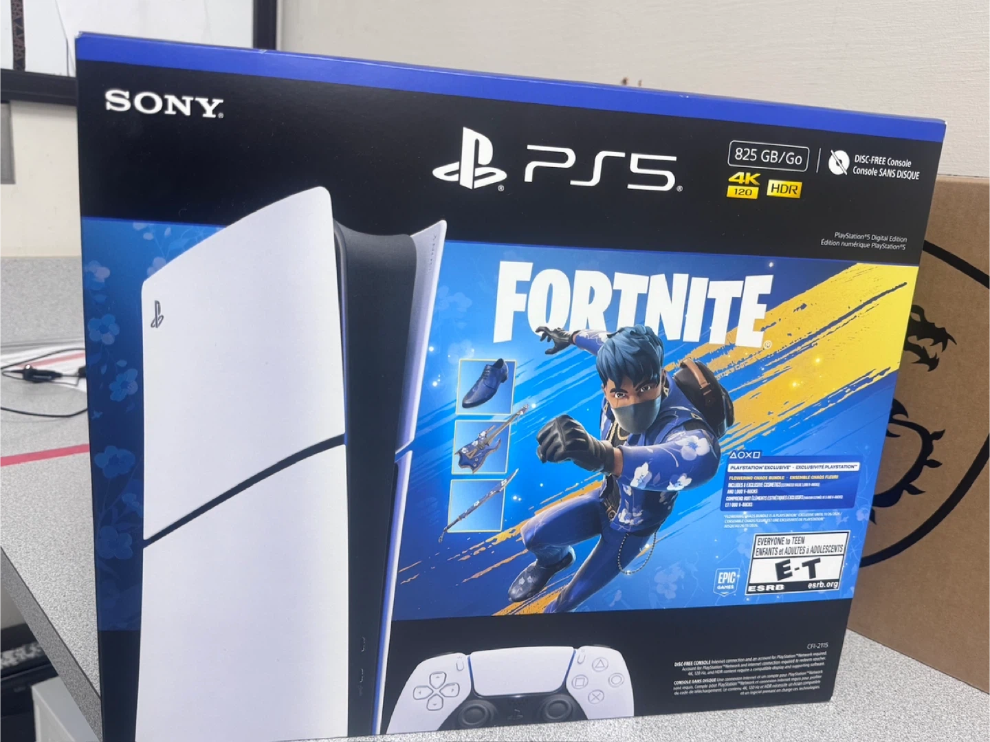 PlayStation 5 Digital Edition console includes a DualSense Wireless Controller. It also comes with a voucher for the Fortnite: The Last Laugh Bundle. This disc-free console offers 825 GB of storage and supports 4K 120Hz HDR.
