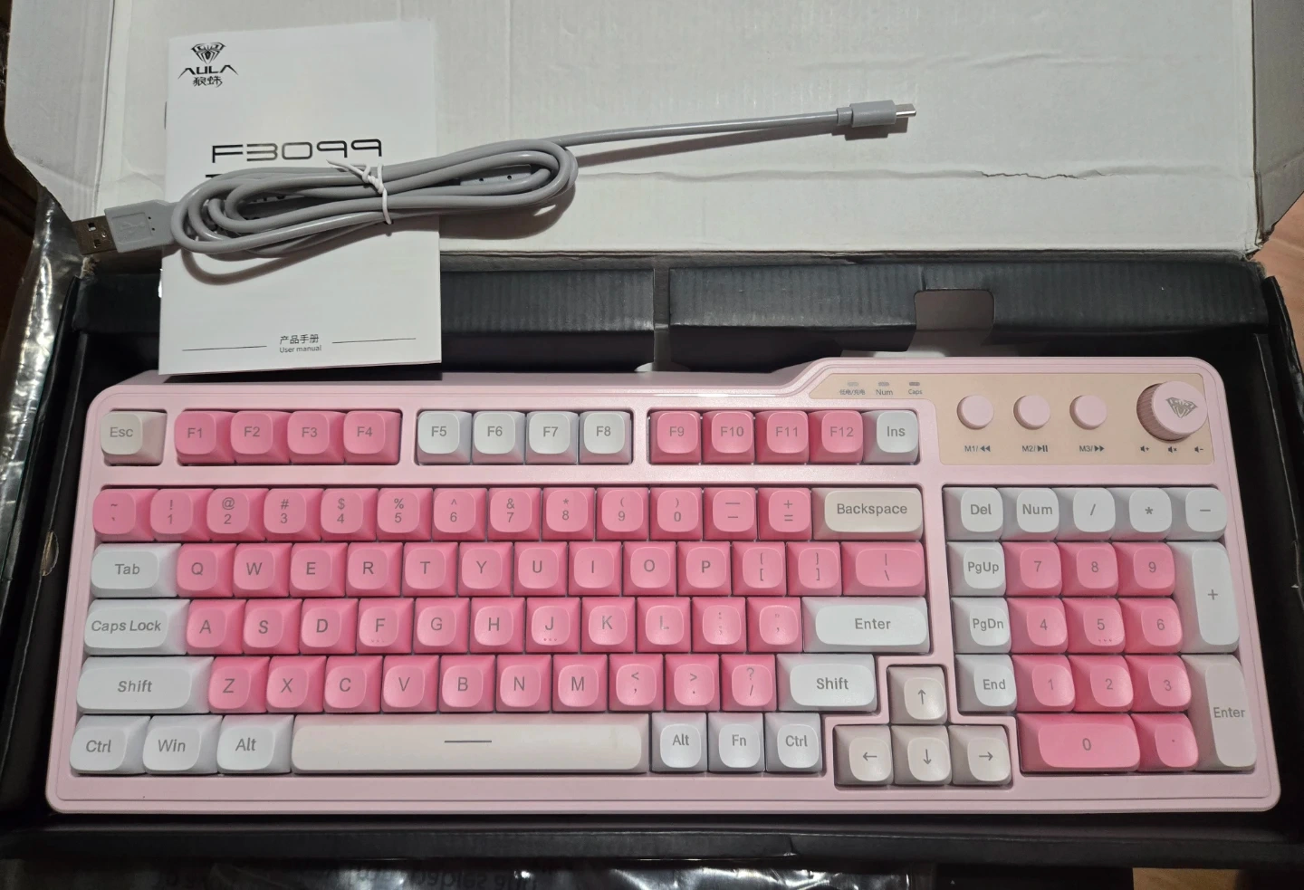 This is a pink AULA F3099 mechanical keyboard. It includes a USB cable and user manual. It's a wired keyboard with a full layout including a number pad.