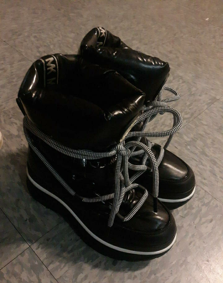 10These are a pair of black Michael Kors puffer style snow boots. They have a lace up front with black and white laces. They are in good condition and perfect for the winter season!
