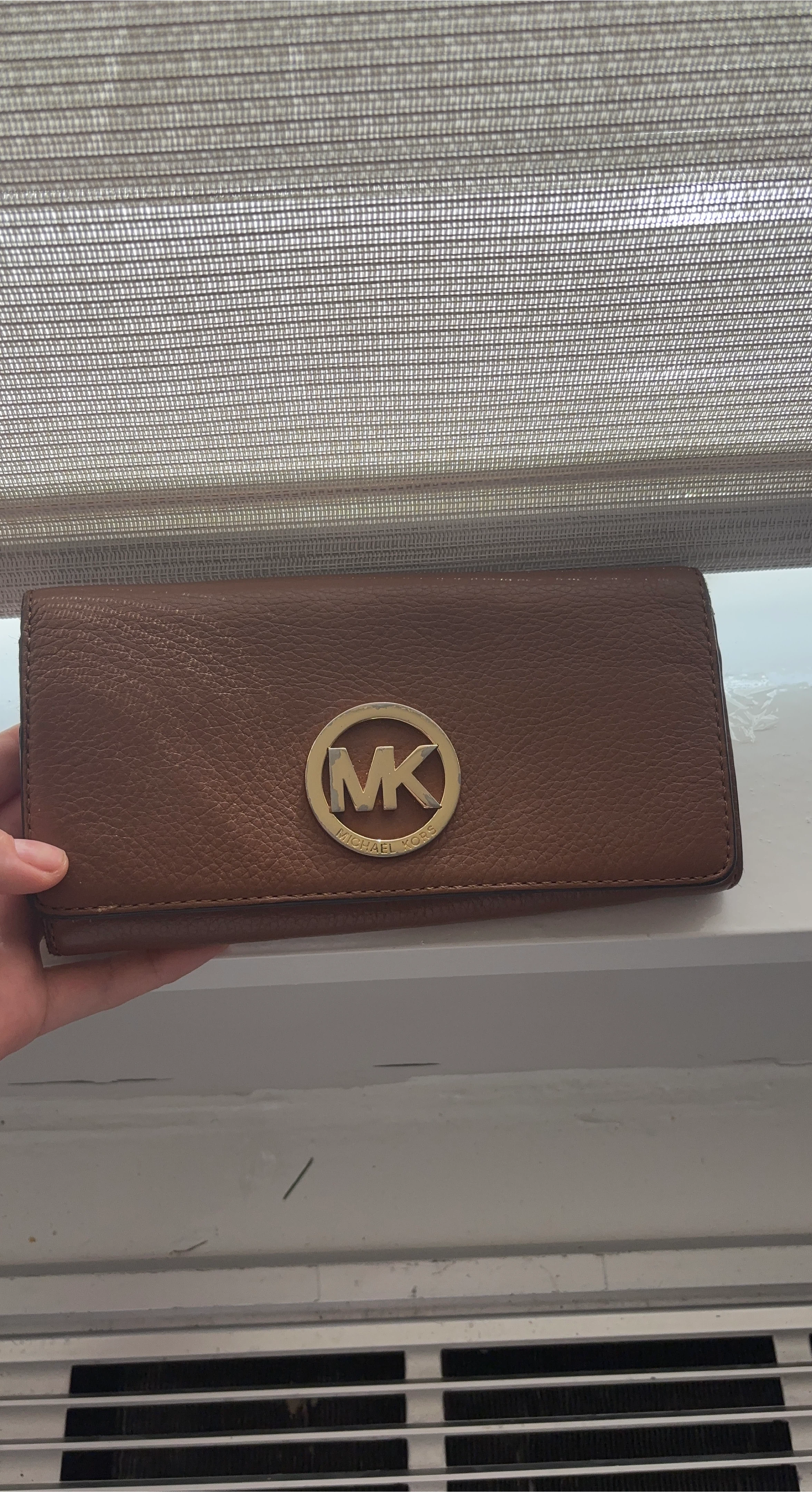 Selling a brown Michael Kors wallet! It's in good condition and has the classic MK logo on the front