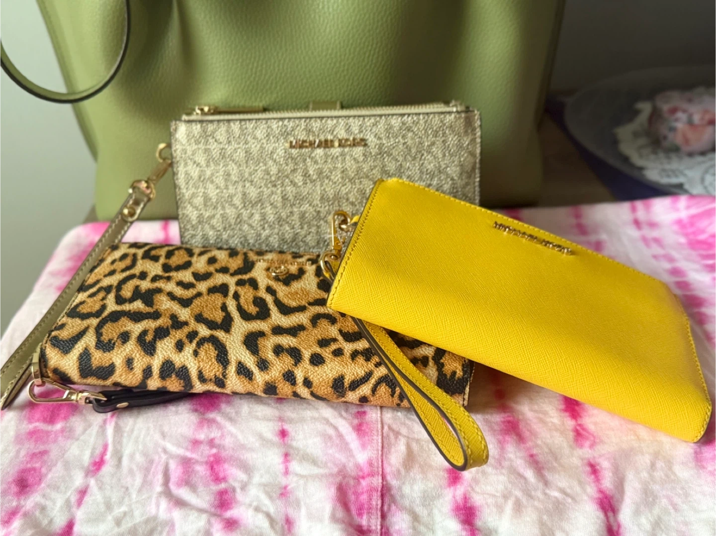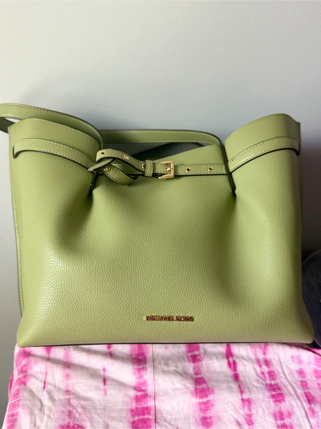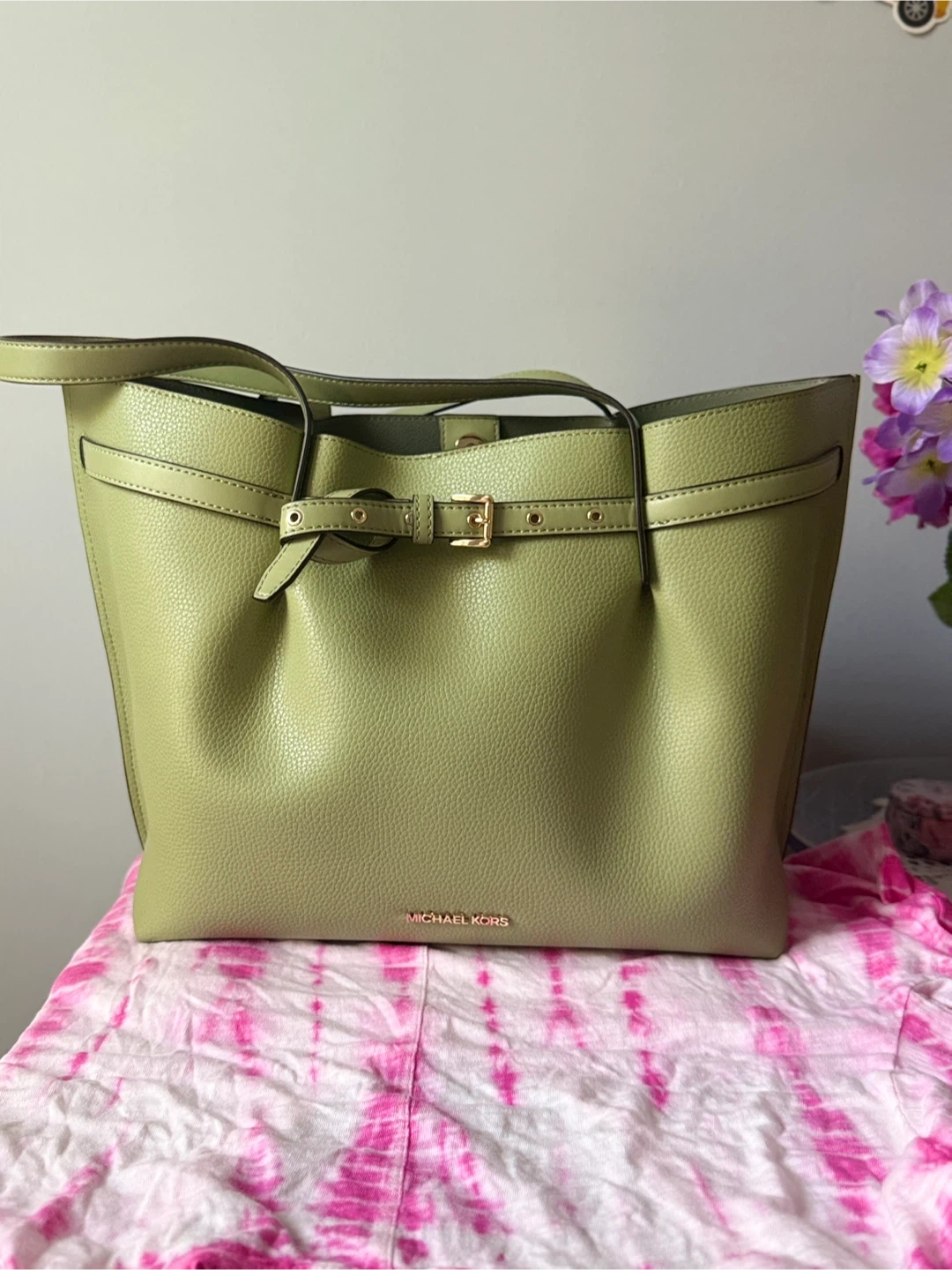 Selling a Michael Kors tote bag in a lovely green color. It's made of leather and features a stylish design with a buckle detail. Perfect for everyday use!