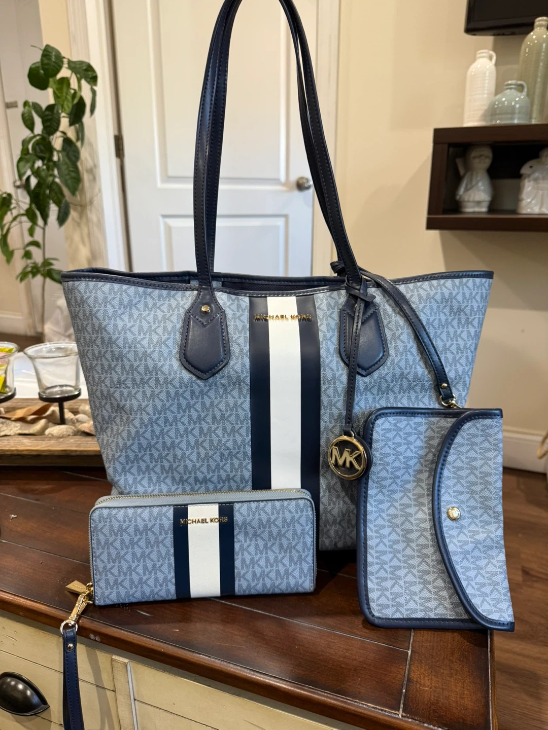 Selling a cute Michael Kors set that includes a tote bag, wallet, and card holder! The set features the signature MK logo print with a stylish stripe design. Perfect for everyday use and keeping your essentials organized