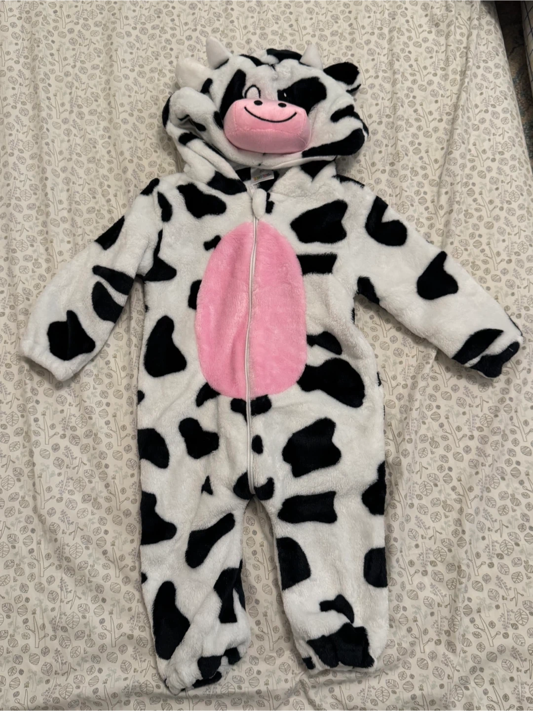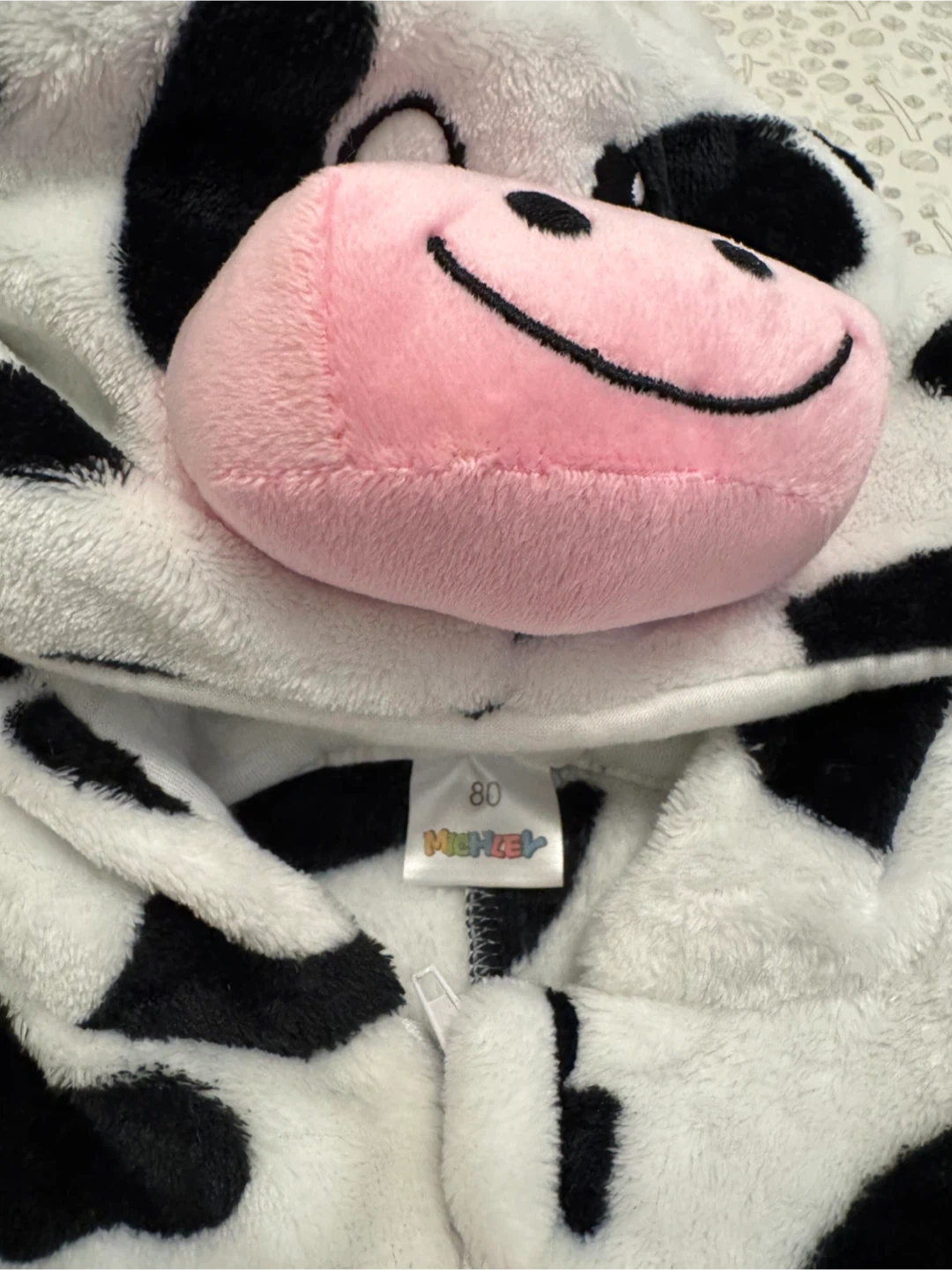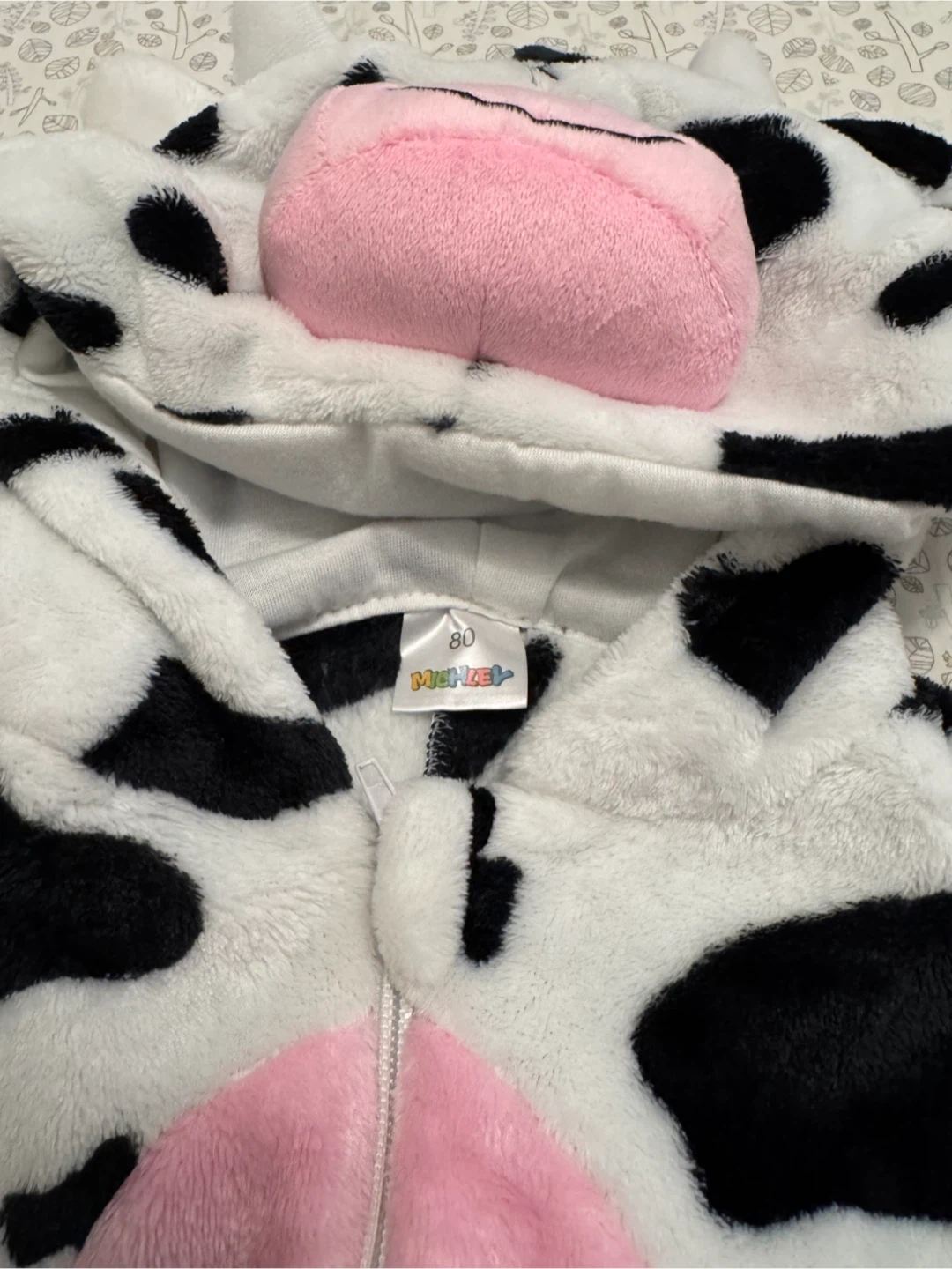 This adorable Michley cow costume onesie is perfect for your little one! It's white with black spots and has a cute pink nose detail on the hood. The size is 80.