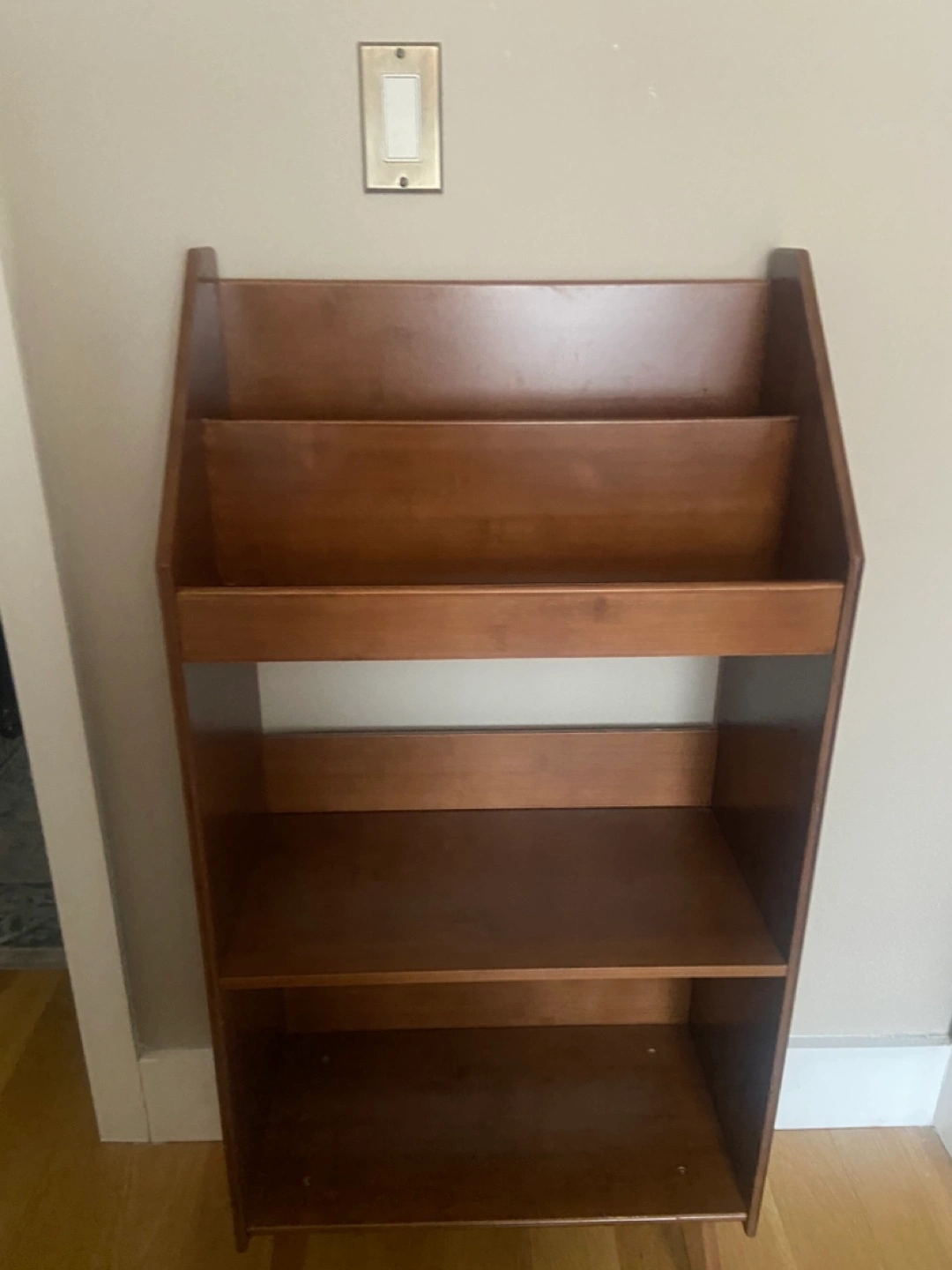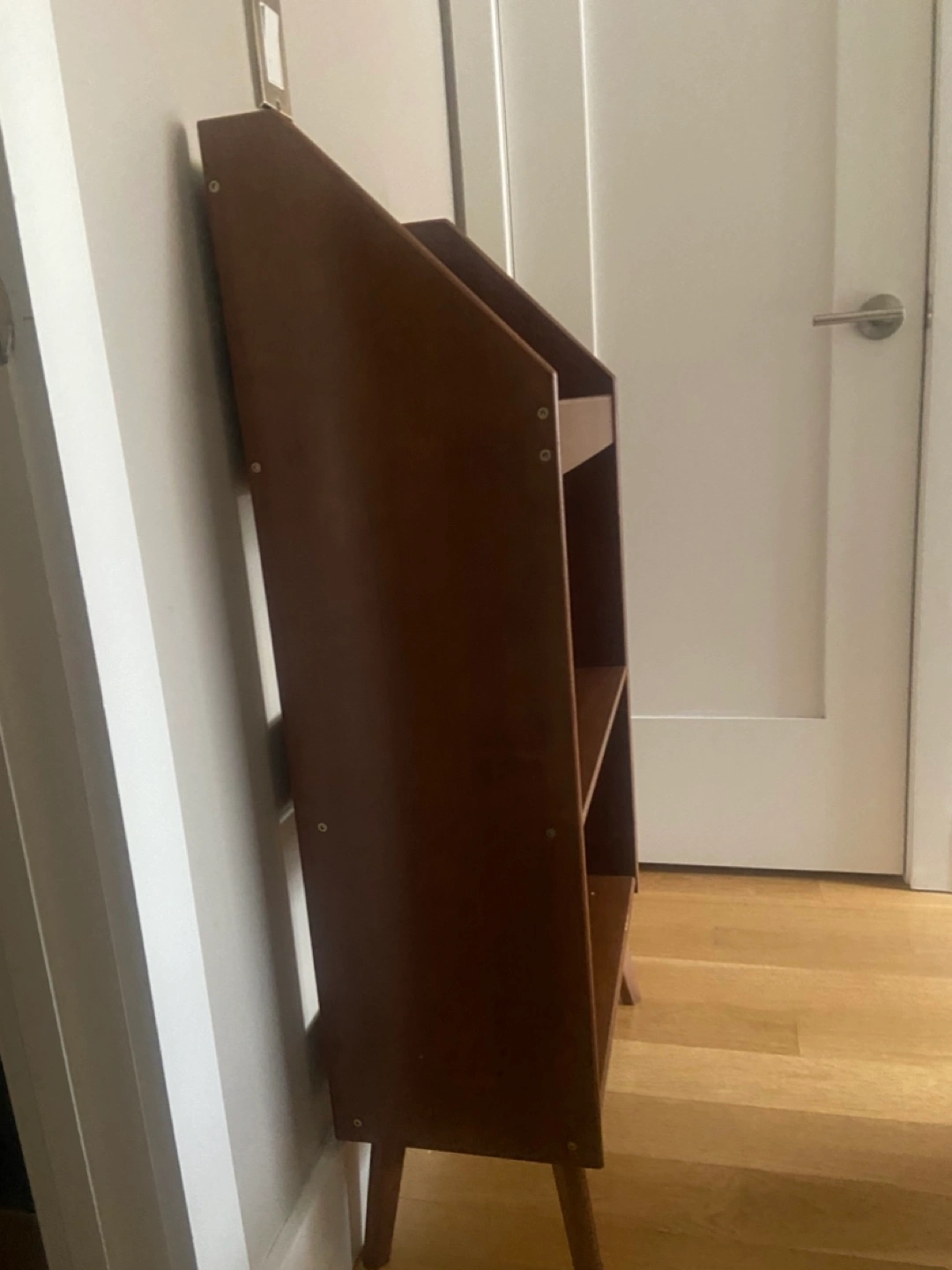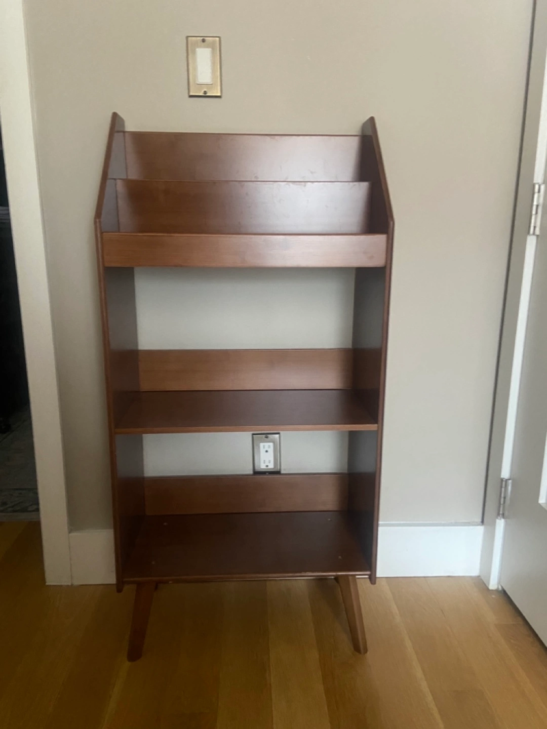 61Dark brown wood bookcase. Three shelves. Mid-century modern style. Small legs. Only used for a year, in amazing condition. We changed the guest room and sadly there is no more space for this pretty item. Hopefully someone gets to enjoy it just as much.
