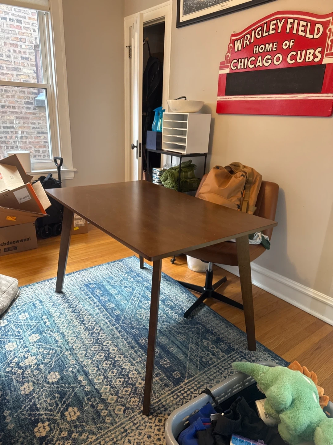 107Selling a gently used mid-century modern style table. Most recently used as a desk, but as a table seats 4. It's a beautiful piece of furniture that would look great in any dining room or office. The desk is made of wood and is in good condition.