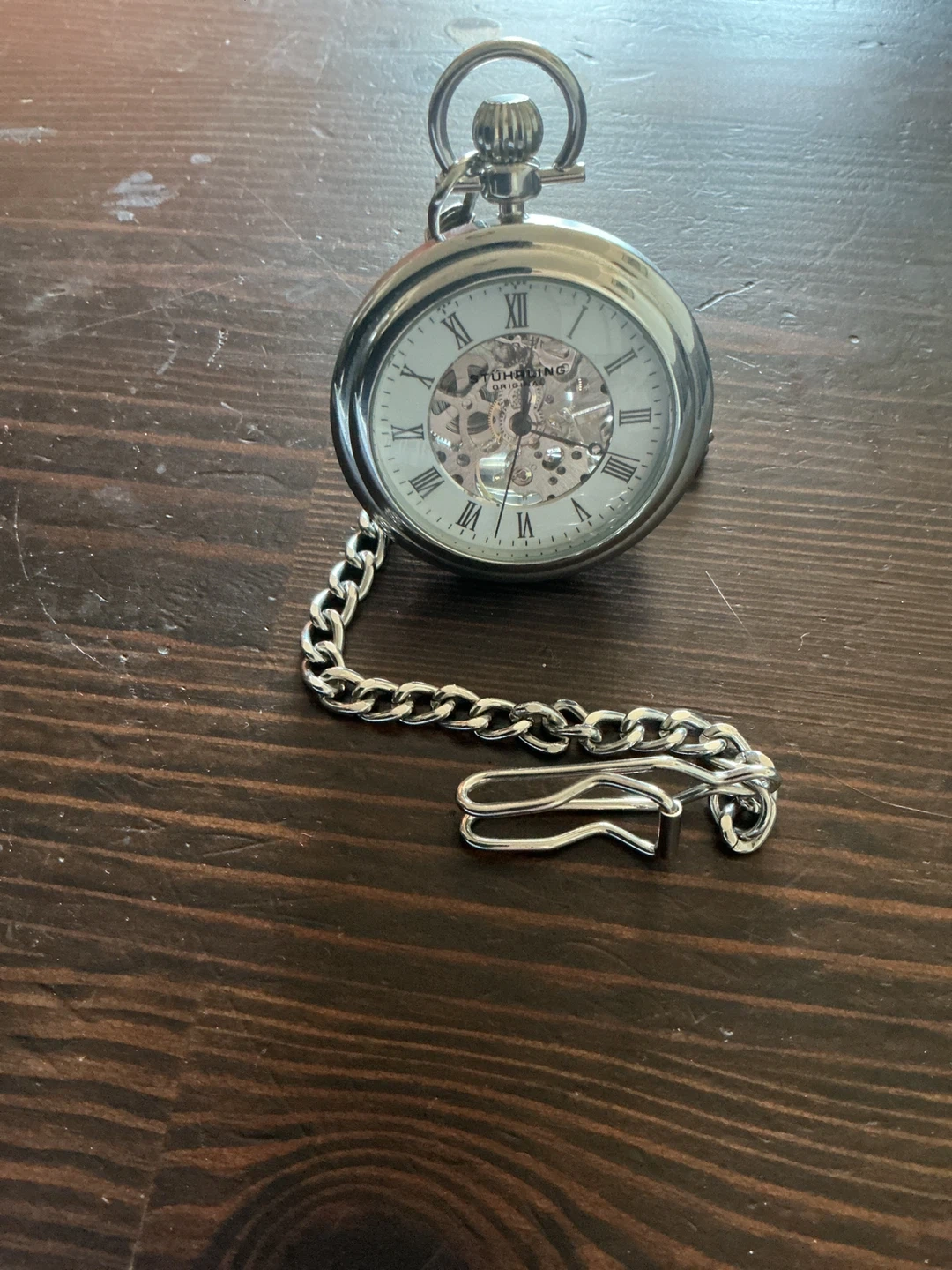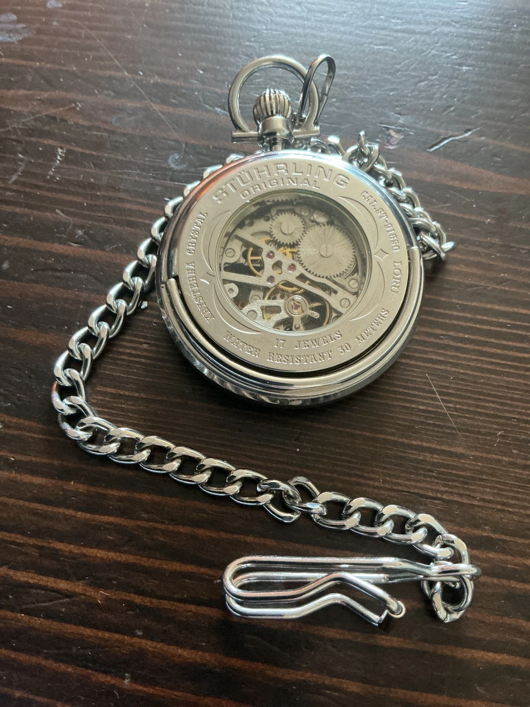 This is a Stuhrling Original skeleton pocket watch with a chain. It features automatic movement, 17 jewels, and is water resistant to 30 meters. The watch has a classic silver-tone case and a Roman numeral dial.