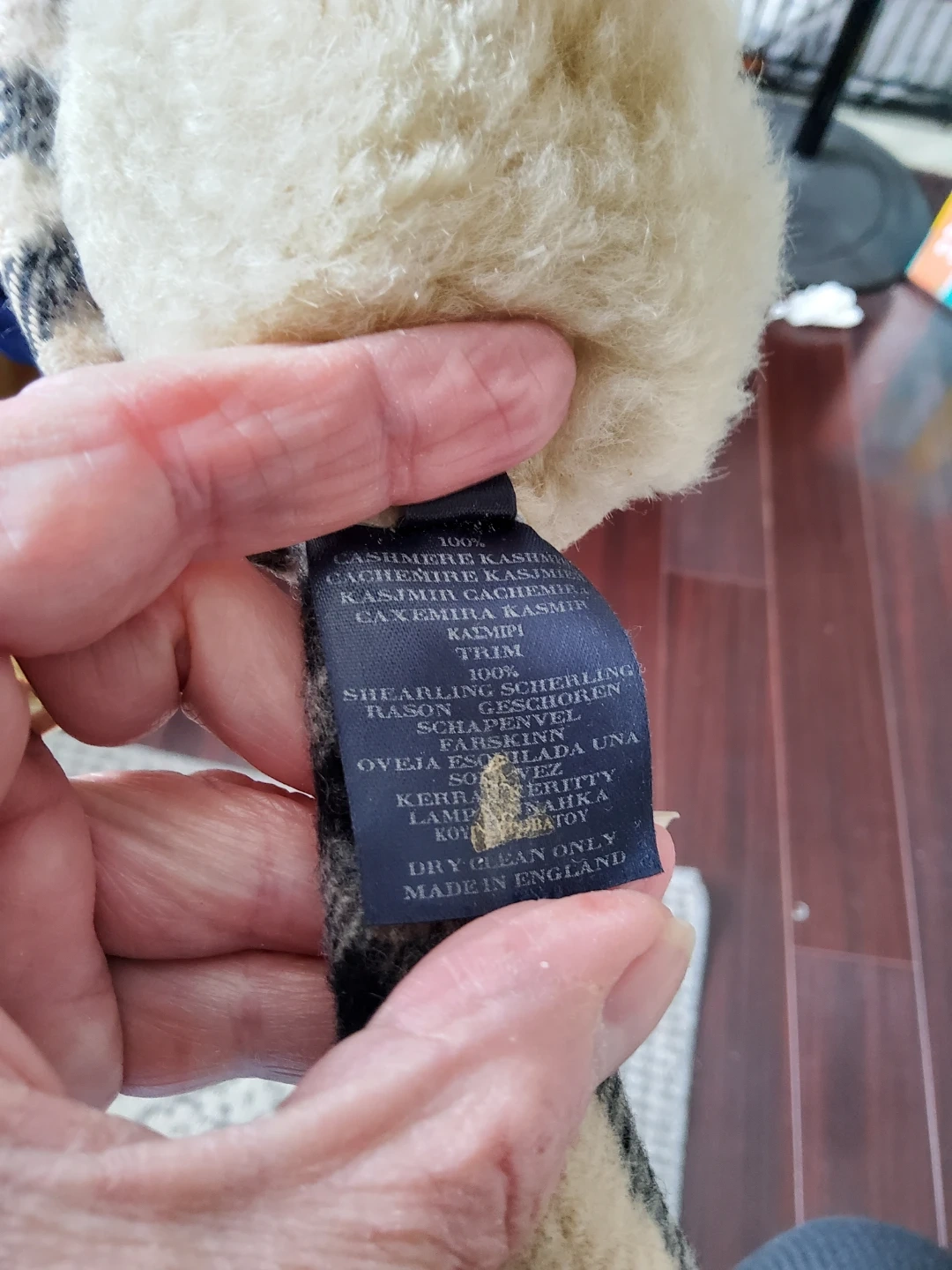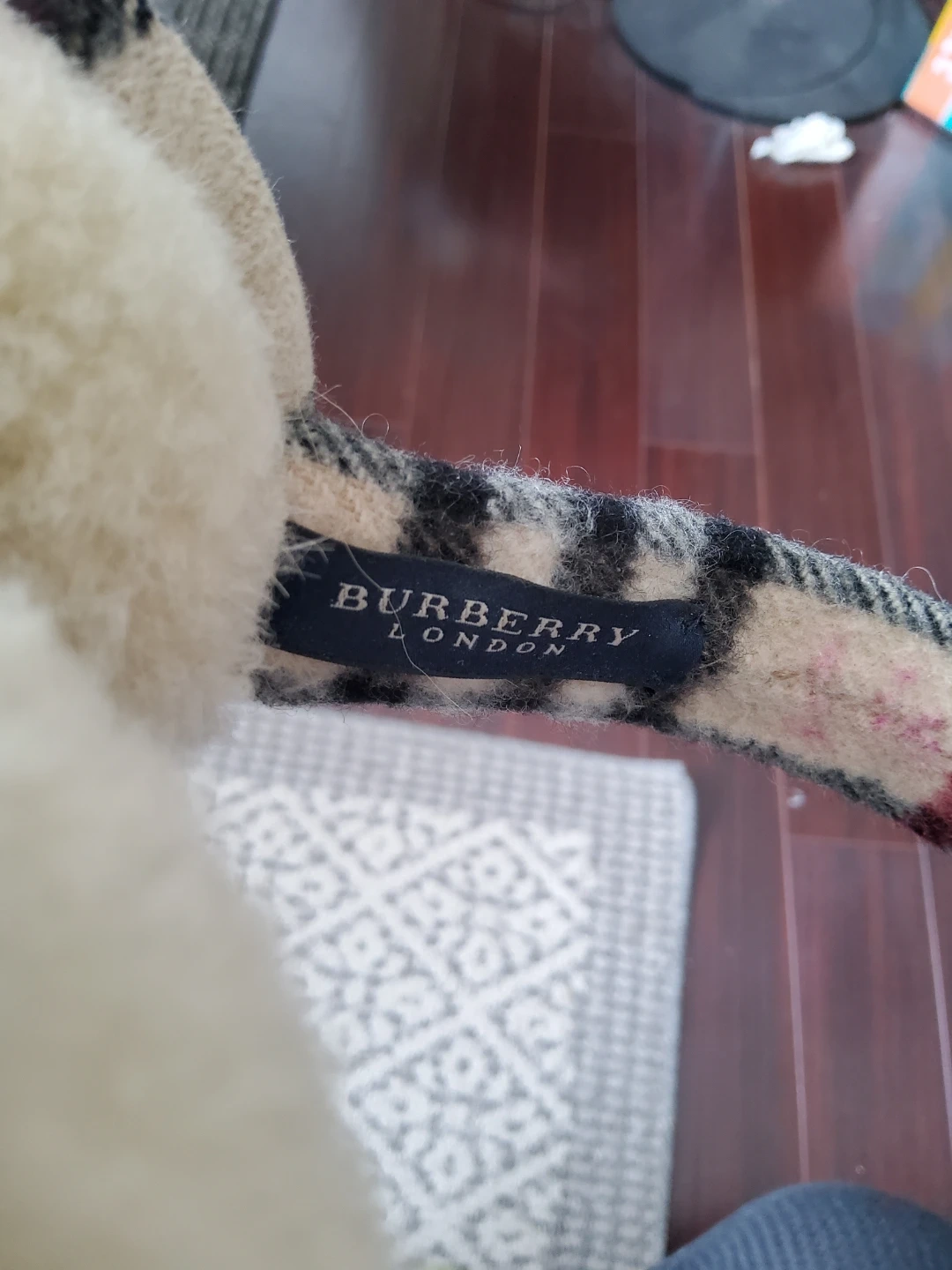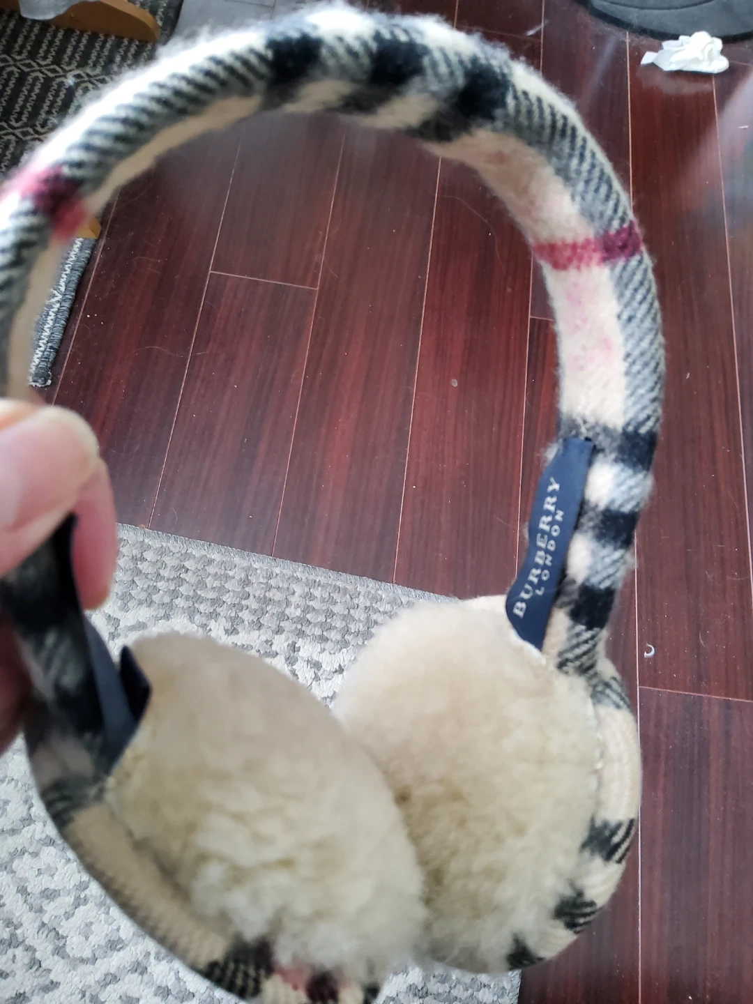 Burberry London earmuffs. Outer trim is 100% cashmere. Inner lining is 100% shearling. Made in England. Dry clean only.