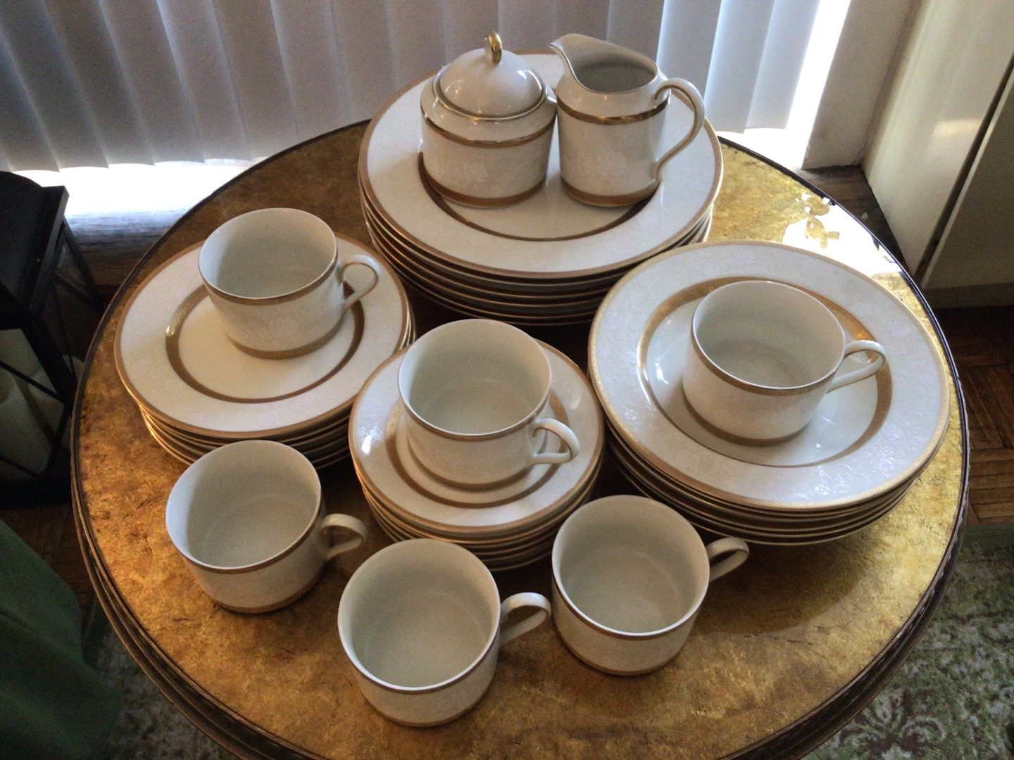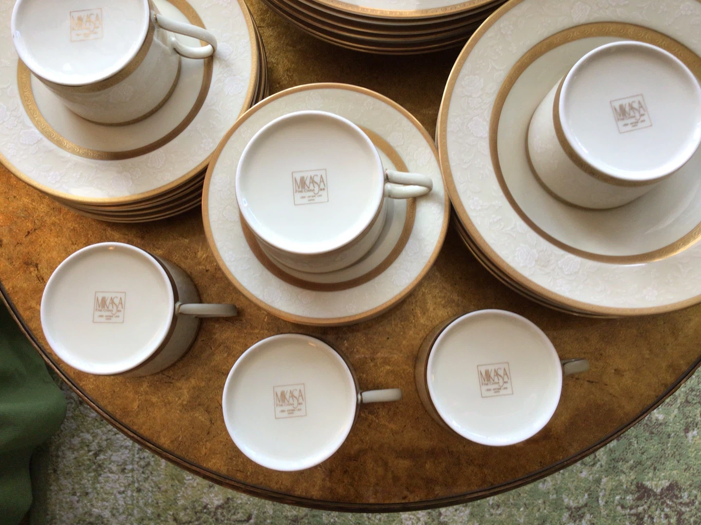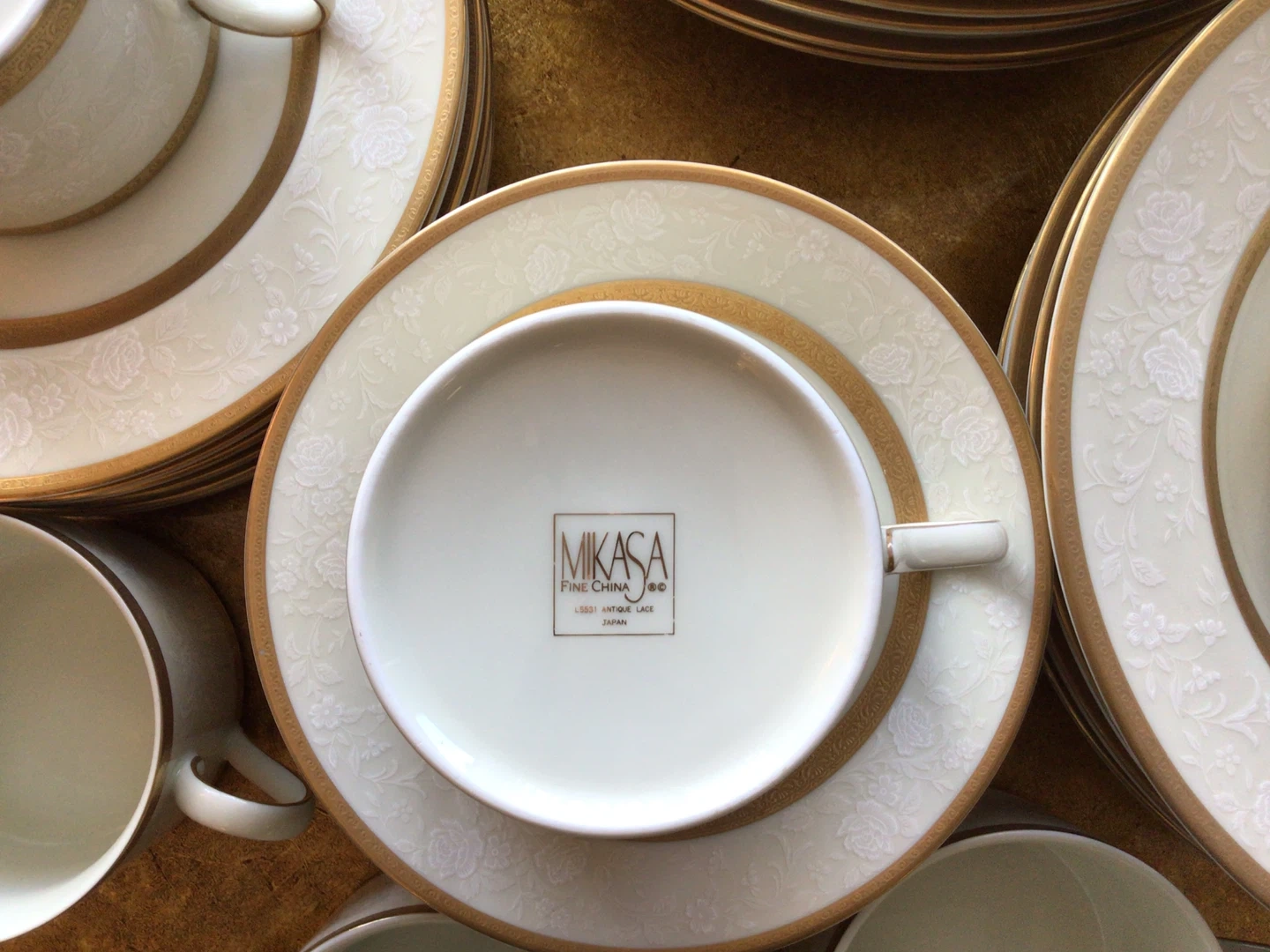 Antique Lace Collection By Mikasa (6 Sets /5-Piece Place Setting + Sugar Bowl + Creamer) Antique Lace Collection By Mikasa (6 Sets /5-Piece Place Setting + Sugar Bowl + Creamer). There are 32 pieces on total. All in perfect condition with the exception of a small chip on one dinner plate. See in photo. Crafted in Japan. Flat cup and saucer, 2 .3/8” . Dinner Plate , 10 .7/8”. Salad Plate, 7.5/8”. Rim Soup Bowl, 8.5”. Standard size Sugar Bowl and Creamer.