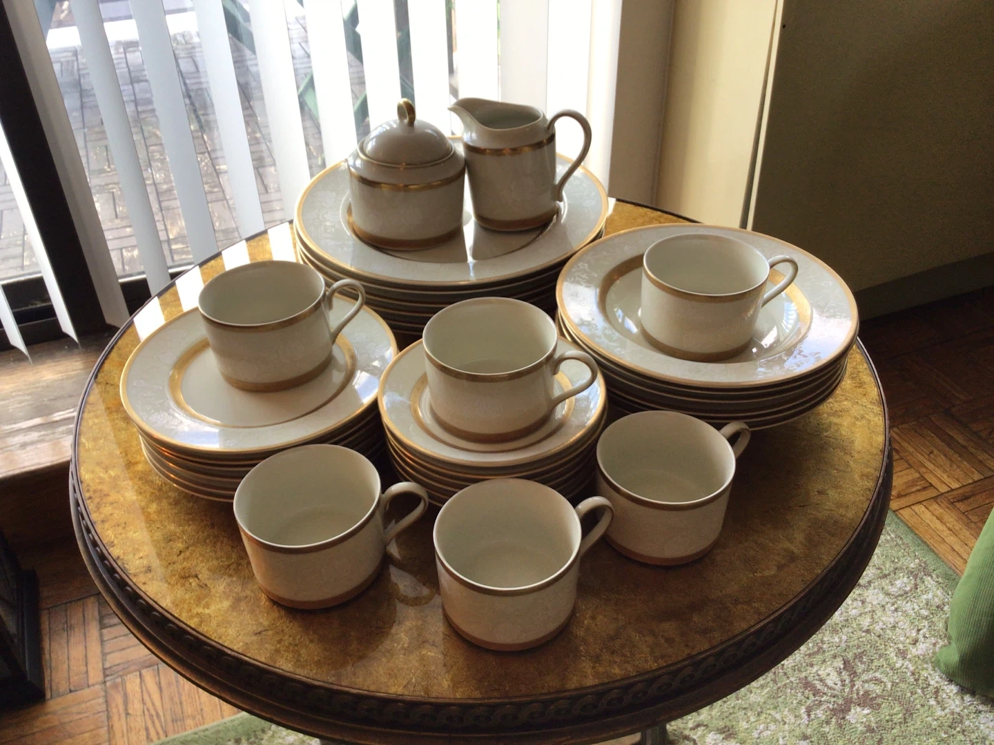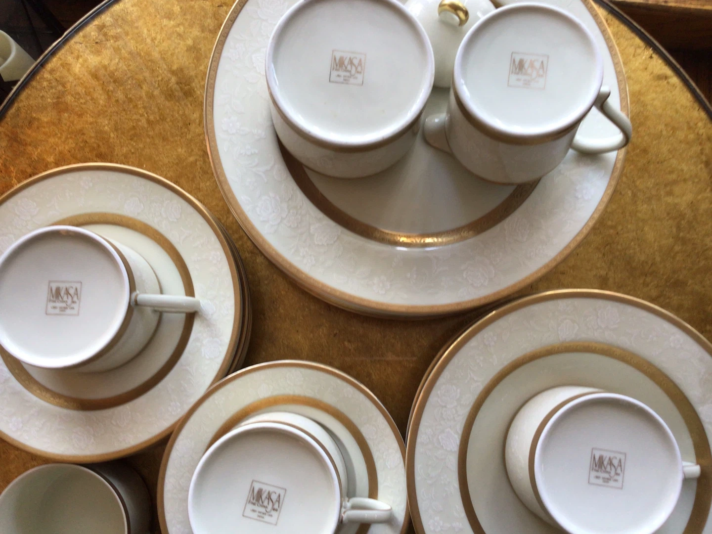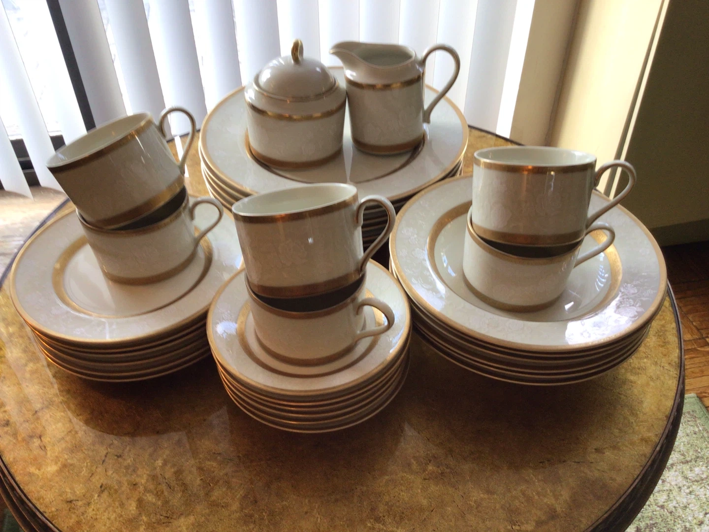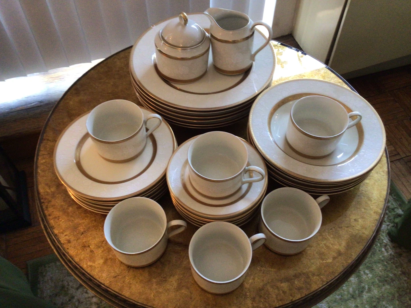 Antique Lace Collection By Mikasa (6 Sets /5-Piece Place Setting + Sugar Bowl + Creamer) Antique Lace Collection By Mikasa (6 Sets /5-Piece Place Setting + Sugar Bowl + Creamer). There are 32 pieces on total. All in perfect condition with the exception of a small chip on one dinner plate. See in photo. Crafted in Japan. Flat cup and saucer, 2 .3/8” . Dinner Plate , 10 .7/8”. Salad Plate, 7.5/8”. Rim Soup Bowl, 8.5”. Standard size Sugar Bowl and Creamer.