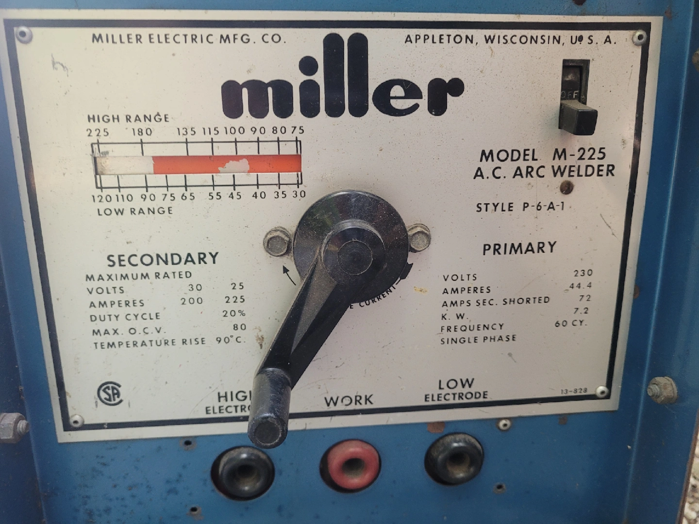 Selling a Miller M-225 A.C. Arc Welder. It has a style P-6-A-1. The primary volts are 230, with amperes at 44.4. The frequency is 60 CY. Solid machine, welds great. Never used commercialy, was my Dad's who did some home/hobby welding. Comes with custom dolled and leads.