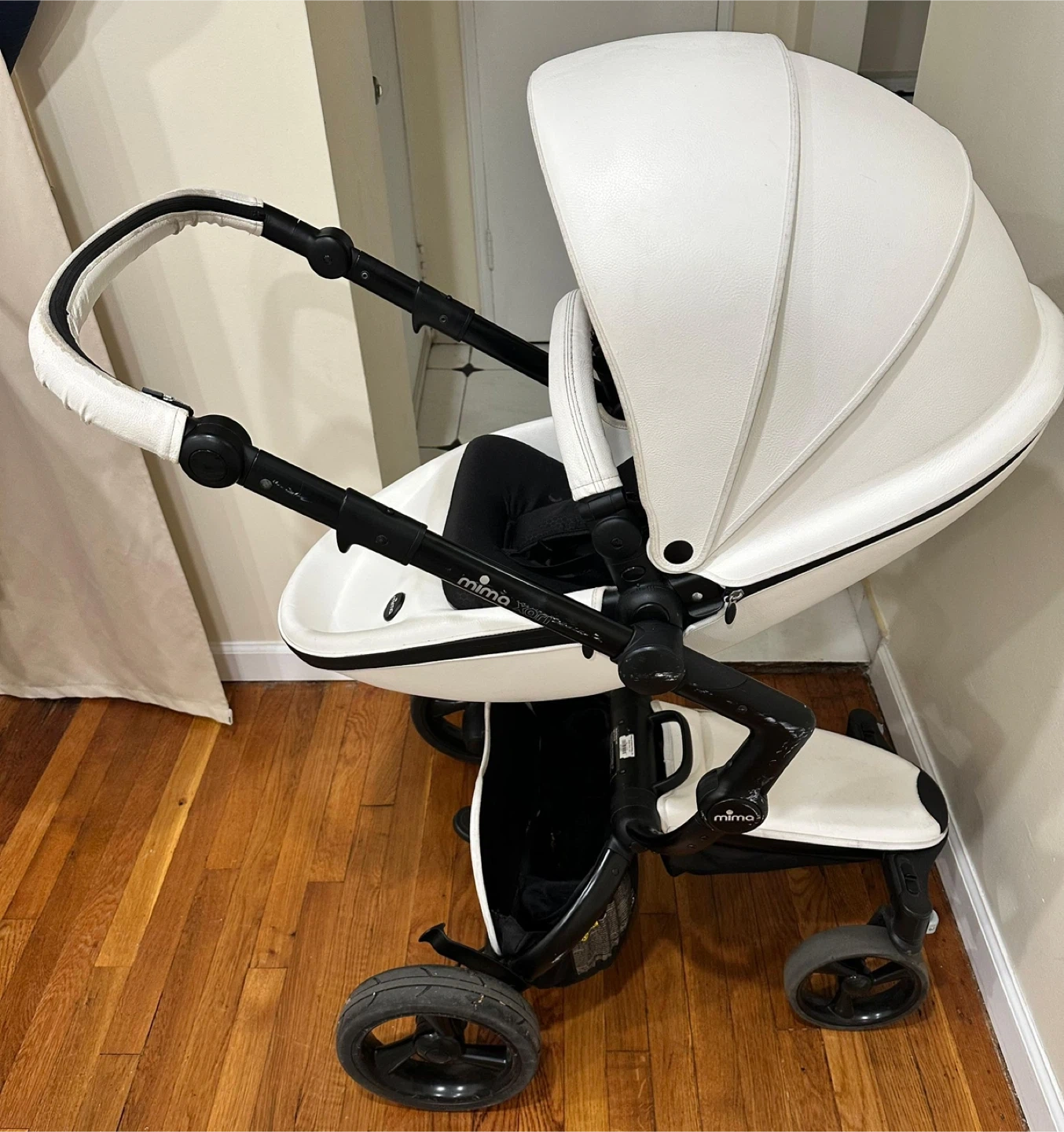 Selling a Mima Xari stroller in white! It's in great condition and ready for a new family. This stroller is stylish and functional, perfect for navigating city streets or park trails. It's known for its unique design and comfortable ride for your little one