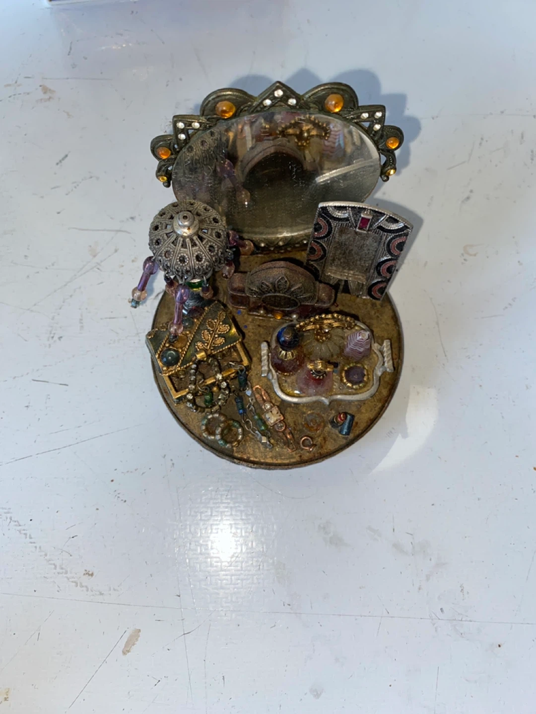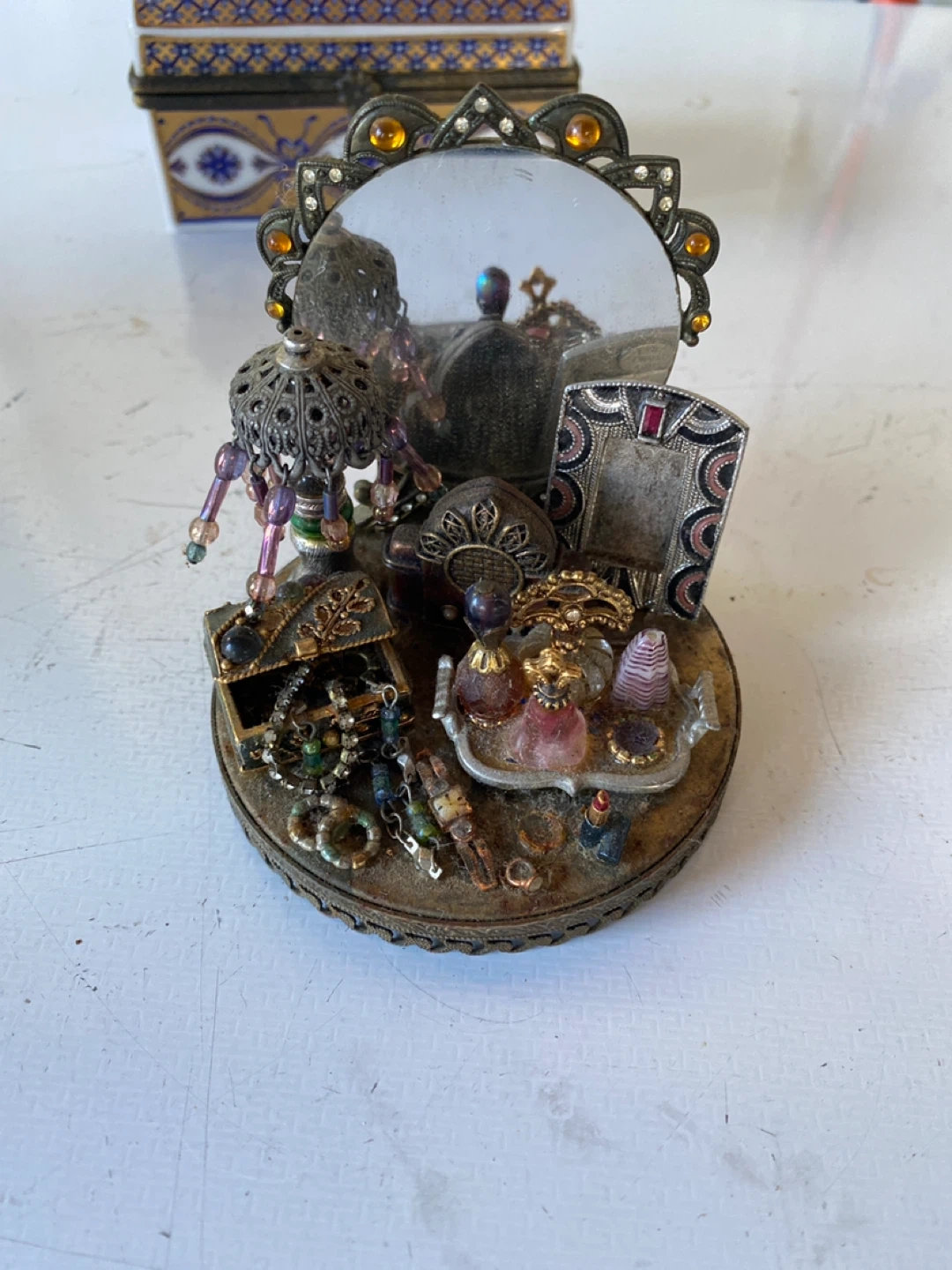 60This is a unique miniature vanity table set with various accessories. It's a charming decorative piece that would look great on a shelf or desk! It features a small mirror and several tiny decorative items.