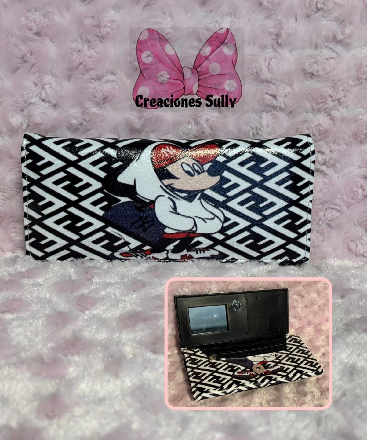 This is a cute wallet with a Minnie Mouse design! It features a black and white pattern with Minnie Mouse on the front. The inside has a mirror and slots for cards and cash