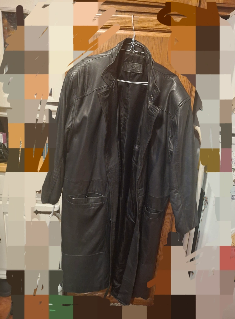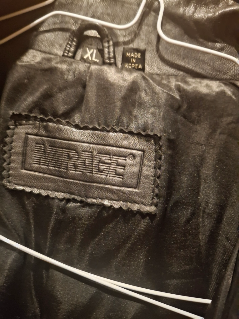 5Selling a Mirage black leather trench coat in size XL. It's a stylish and durable coat, perfect for keeping warm and looking sharp. Made in Korea.