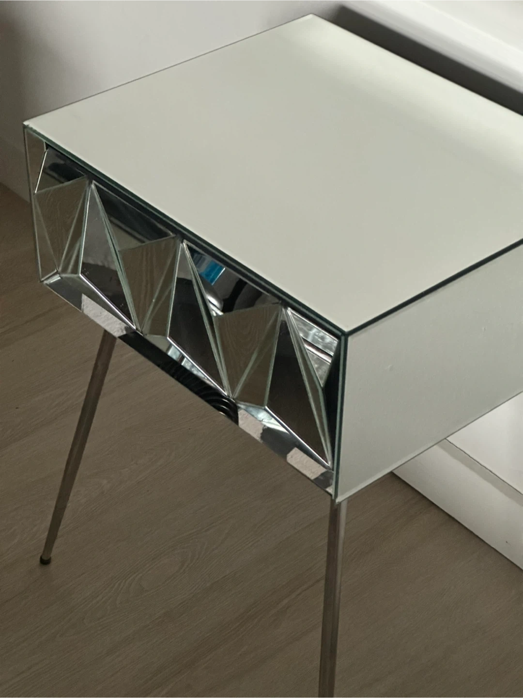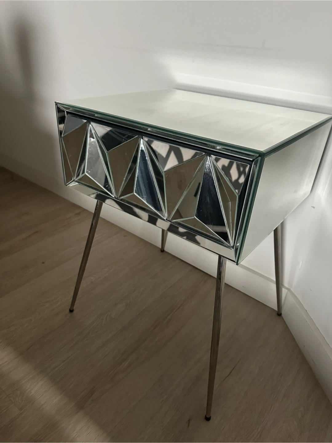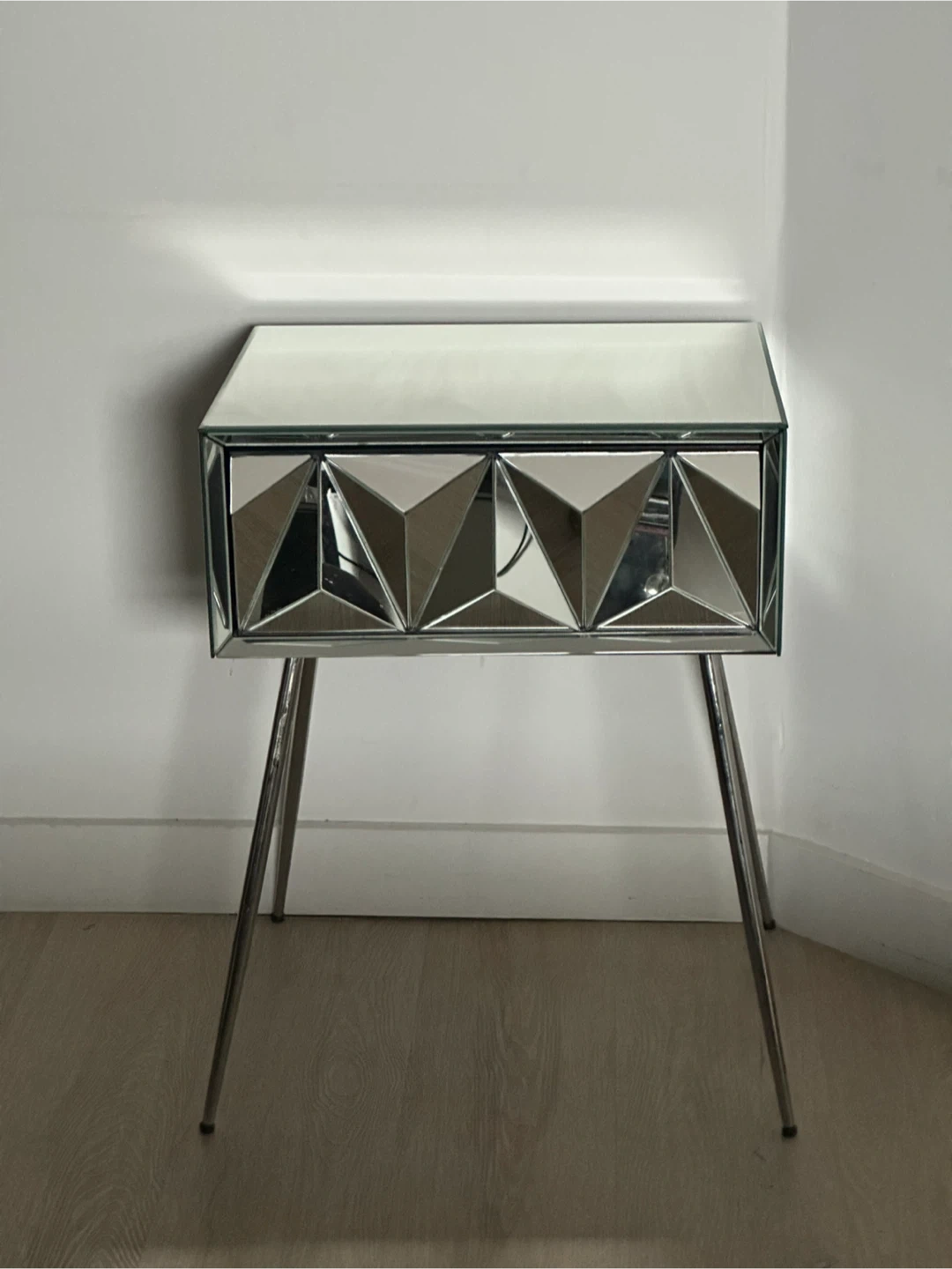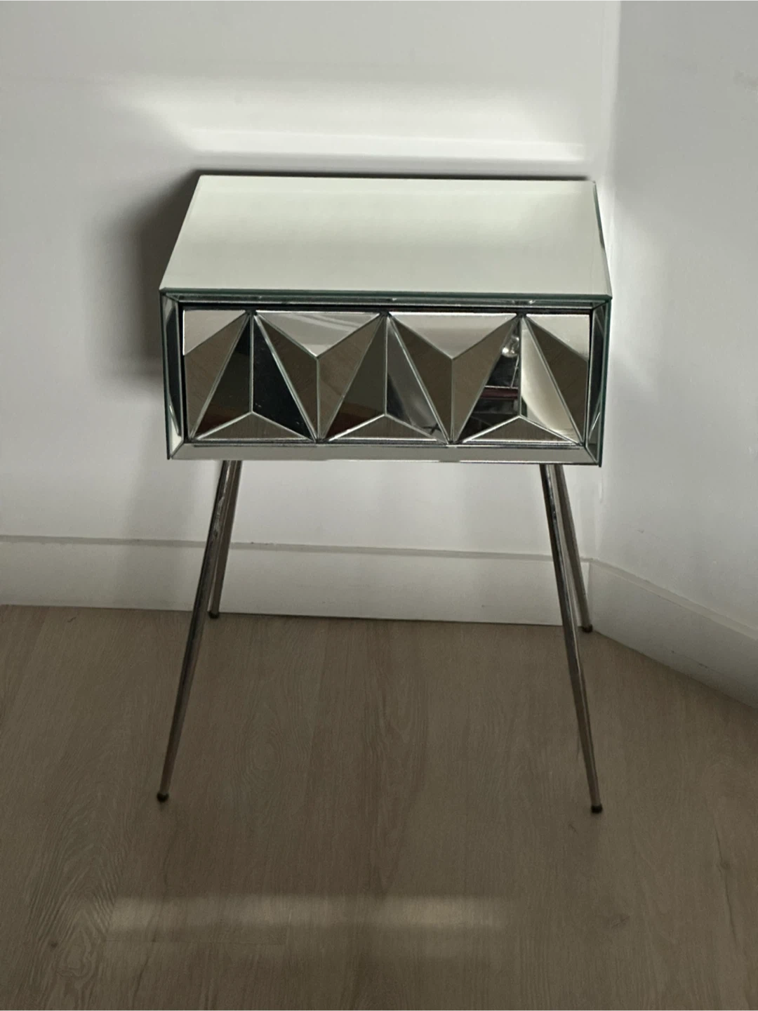 Selling a mirrored accent table or nightstand. It has a unique geometric design on the drawer front and sleek metal legs. Great for adding a touch of glam to any room! Pick up. Cash only. 18”W x 15”D X 23.5”H
