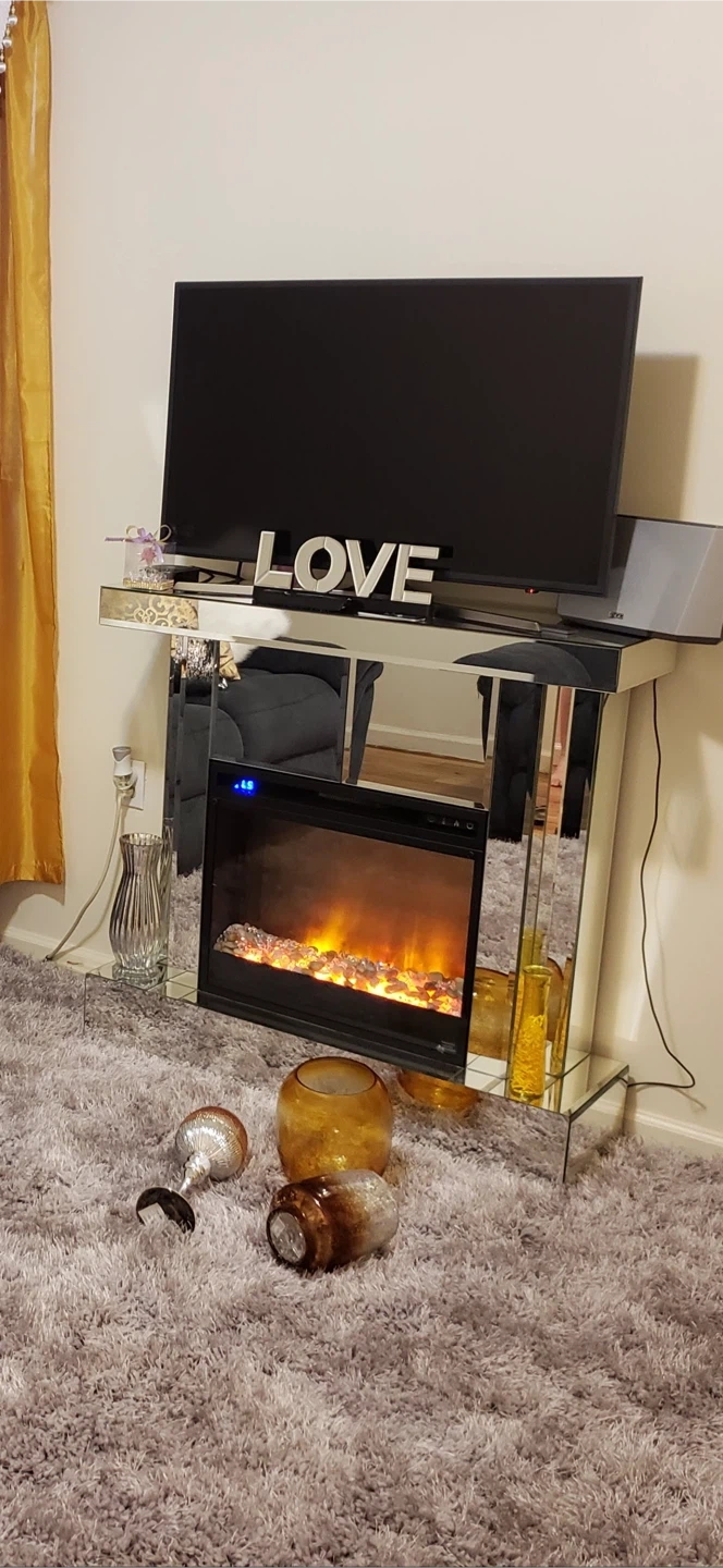 10Selling a mirrored TV stand with an electric fireplace insert. It's in good condition and adds a touch of modern elegance to any living room. The fireplace provides a cozy ambiance, perfect for relaxing evenings