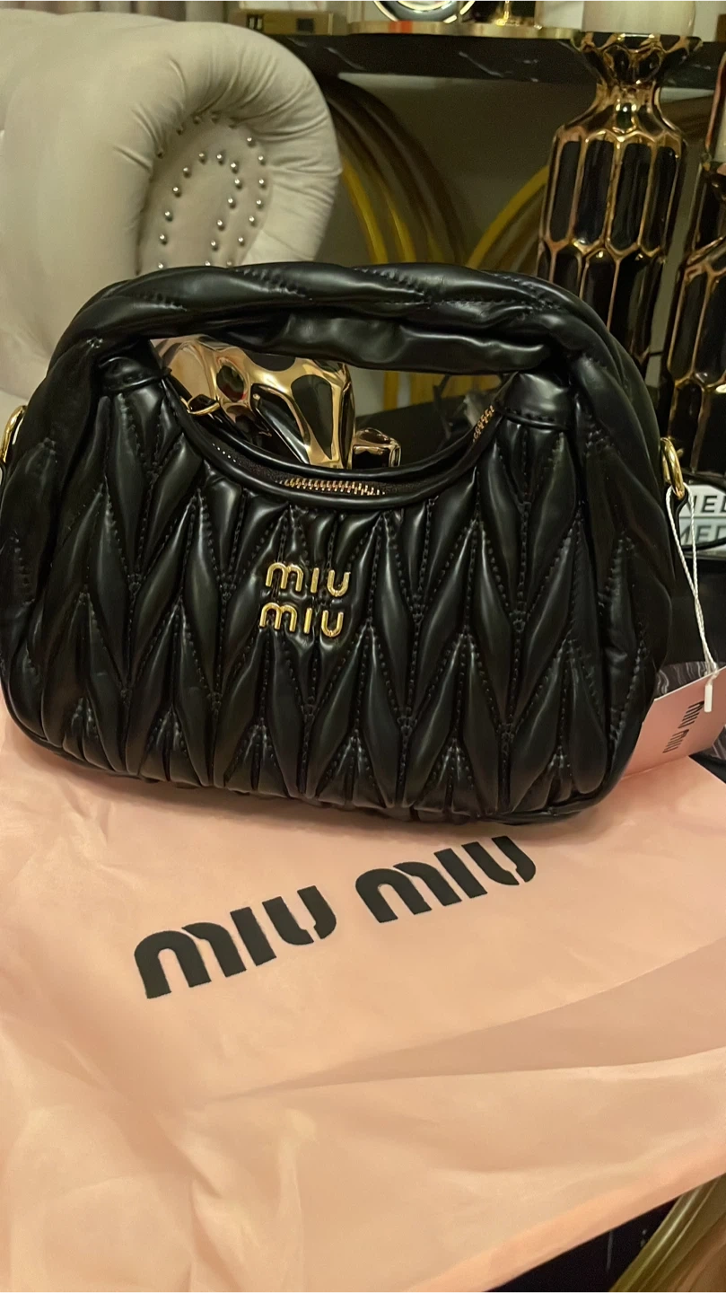 Selling a stylish Miu Miu black leather handbag! It's in used condition and ready for a new home. The bag features a beautiful quilted design and the classic Miu Miu logo. Perfect for adding a touch of luxury to your outfit