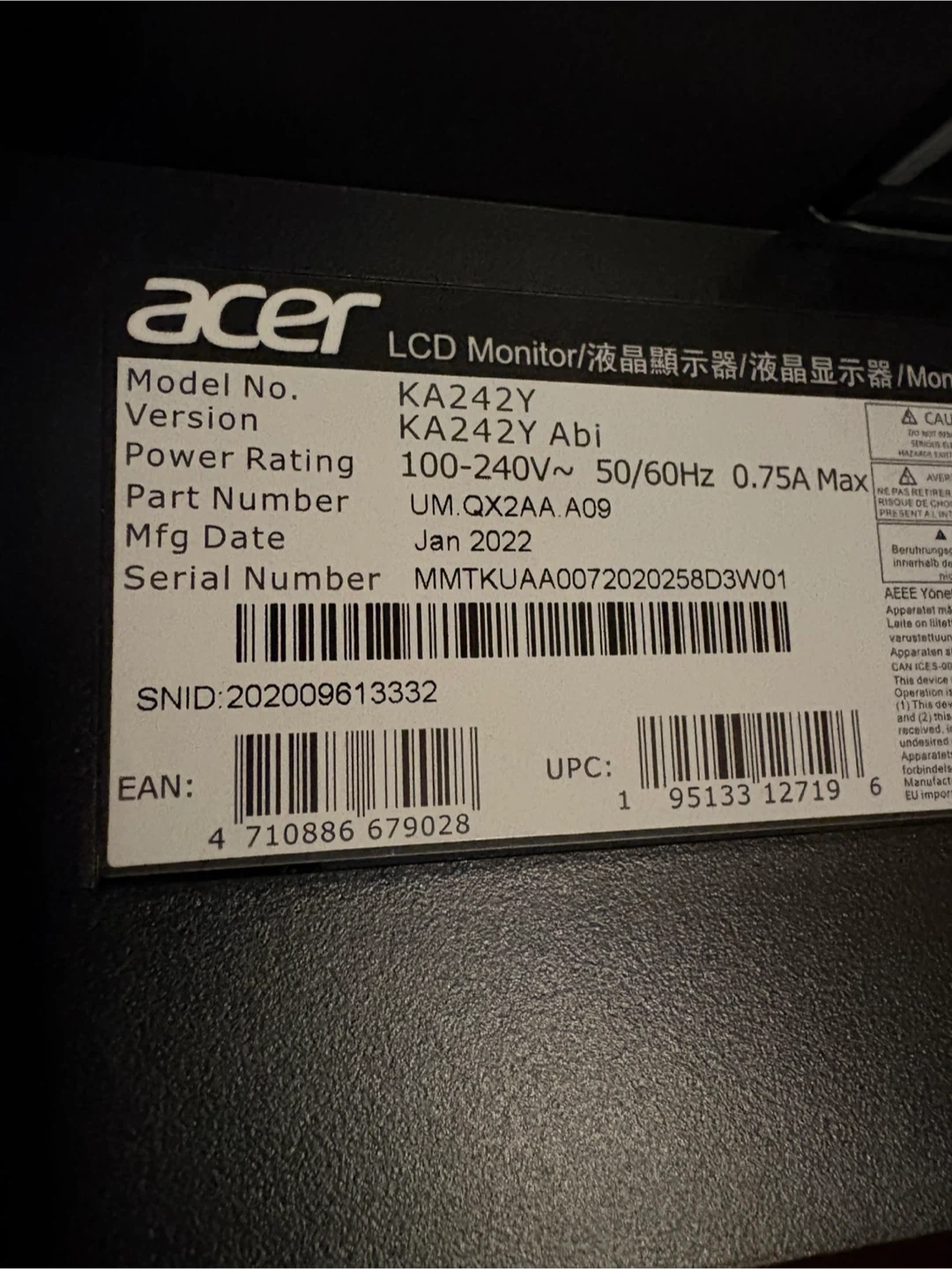 Acer 23.8 inch LCD monitor. Model KA242Y Abi. Manufacturing date January 2022. It's a 100-240V~ 50/60Hz 0.75A Max monitor.