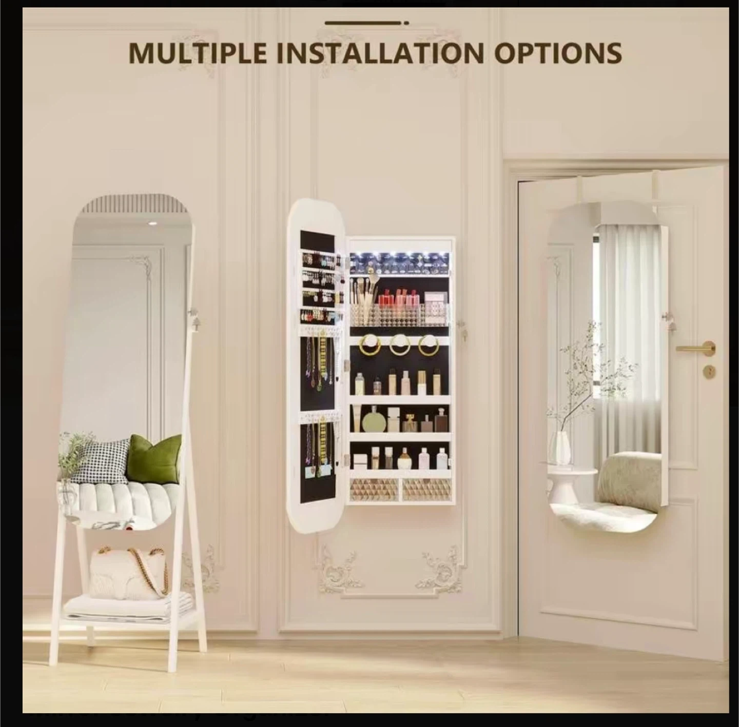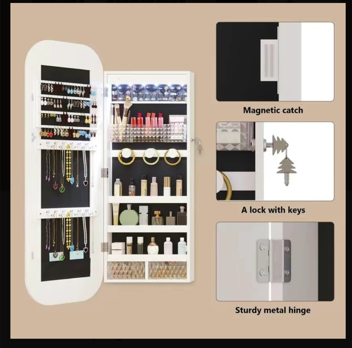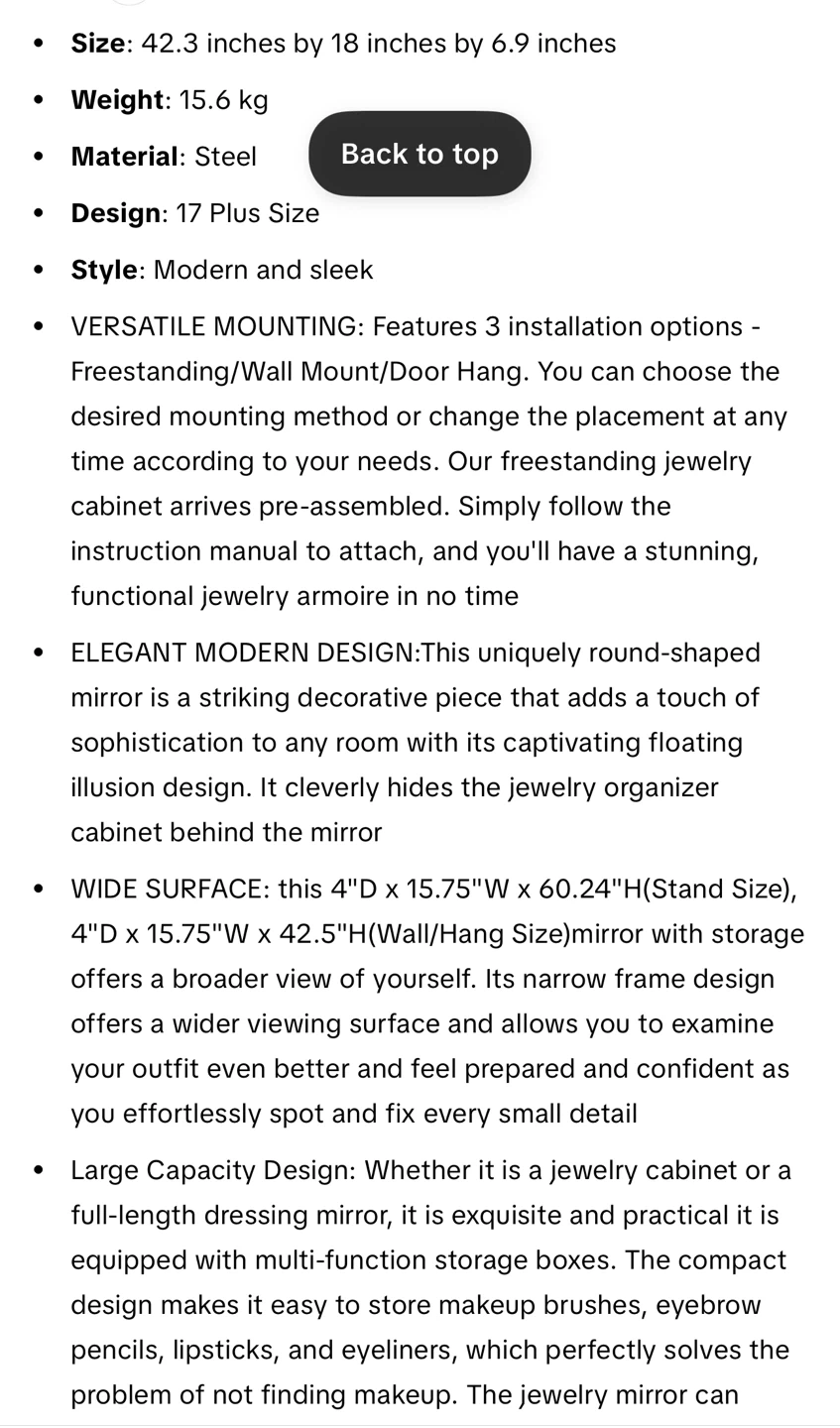 212This Miuvanity LED Mirror Jewelry Cabinet is perfect for organizing your jewelry! It can be mounted on the wall or door, or used as a freestanding mirror. Key features: - Size: 42.3 inches by 18 inches by 6.9 inches - Weight: 15.6 kg - Material: Steel - Design: 17 Plus Size - Style: Modern and sleek - Versatile mounting options: freestanding, wall mount, or door hang