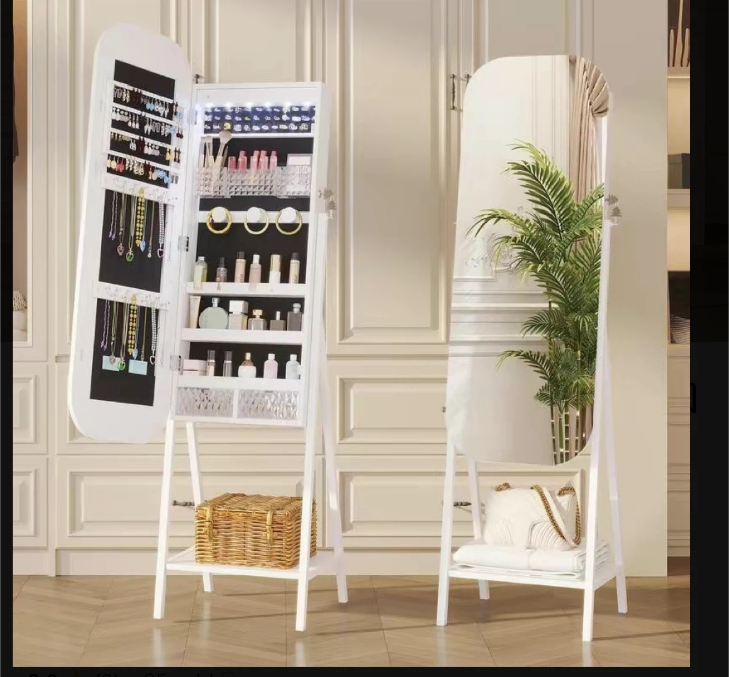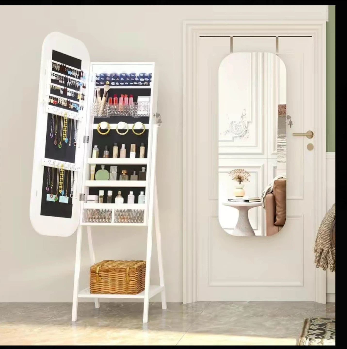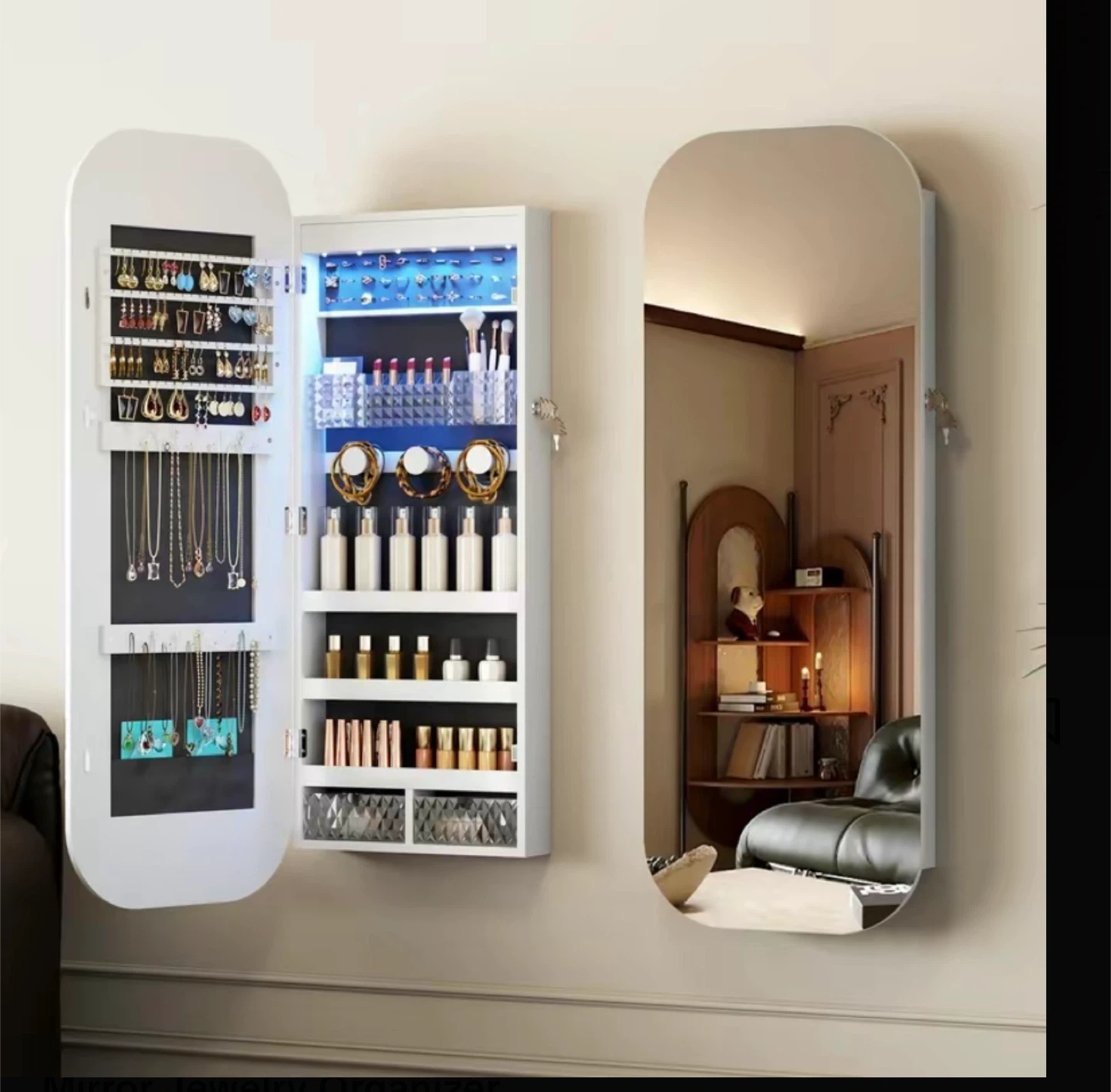 212This Miuvanity LED Mirror Jewelry Cabinet is perfect for organizing your jewelry! It can be mounted on the wall or door, or used as a freestanding mirror. Key features: - Size: 42.3 inches by 18 inches by 6.9 inches - Weight: 15.6 kg - Material: Steel - Design: 17 Plus Size - Style: Modern and sleek - Versatile mounting options: freestanding, wall mount, or door hang