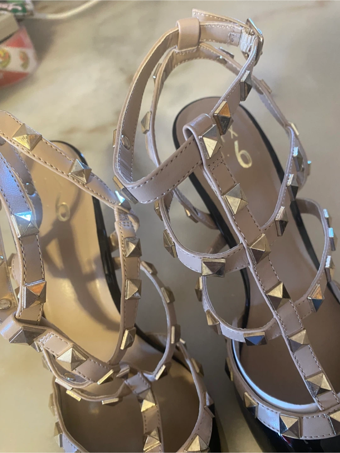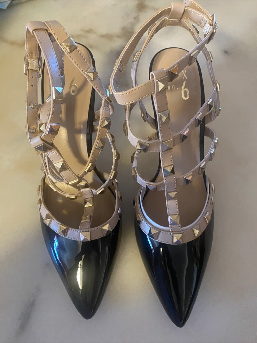 68Selling a pair of Mix No. 6 heels in size 6. They feature a black patent leather with nude straps and gold studs. These are in great condition!