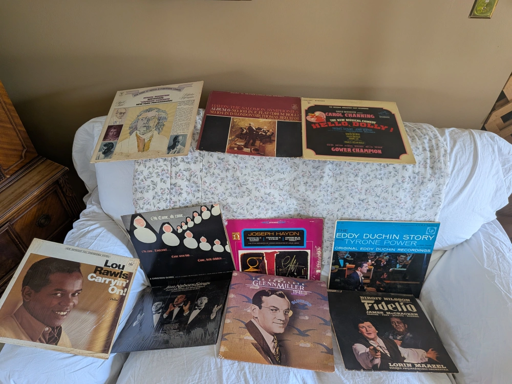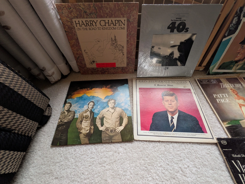 Selling a collection of vinyl records. Titles include: - Harry Chapin - On the Road to Kingdom Come - Greatest Hits of the 40s - John Fitzgerald Kennedy - A Memorial Album - Patti Page - This is my song - Horowitz in Concert - Benny Goodman - Swing Into Spring - Glenn Miller - Connie Francis - Rigoletto - The Who