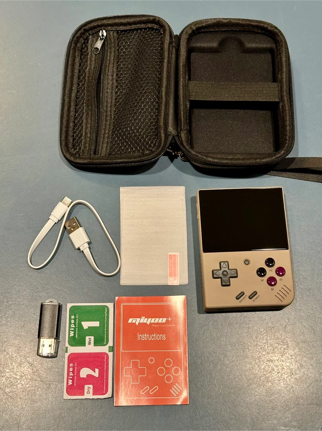 75Selling a Miyoo Mini+ handheld game console. It comes with a case, charging cable, screen protector, and instructions. This portable console is perfect for gaming on the go!