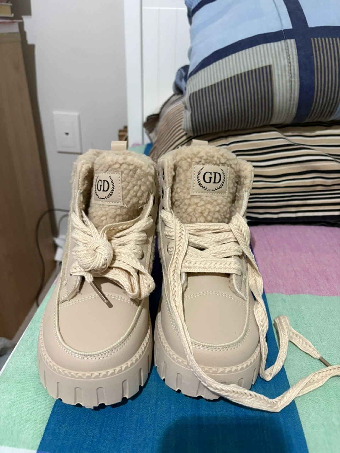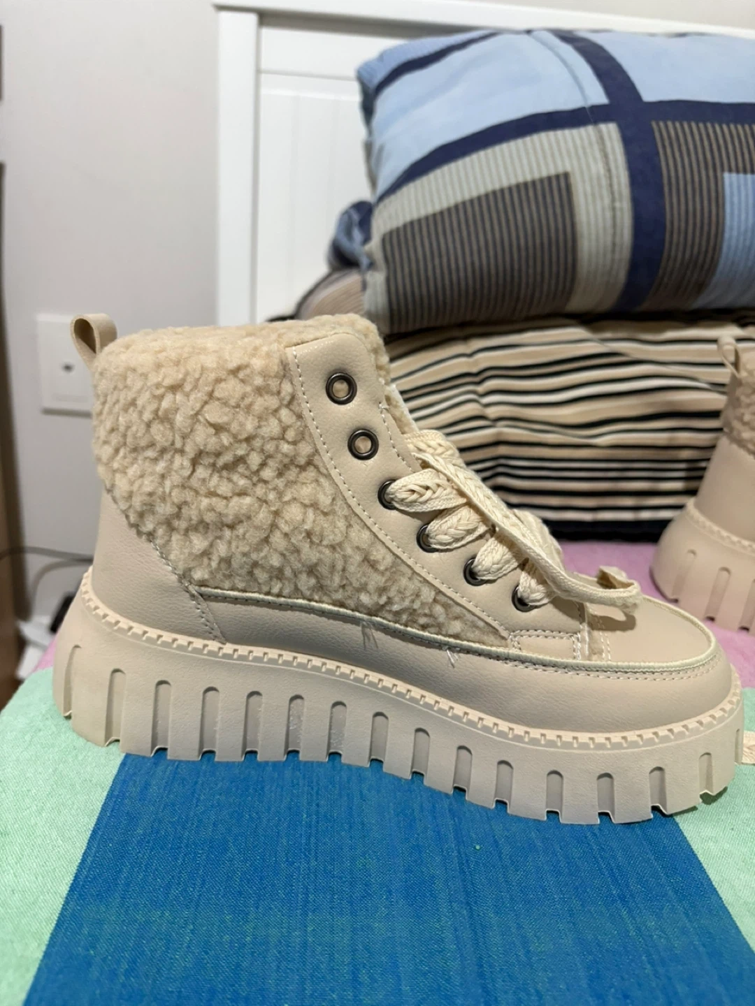 These stylish COÖER boots feature a cozy sherpa lining and a durable beige exterior. They have a lace-up closure for a secure fit. This is a great pair for cooler weather!