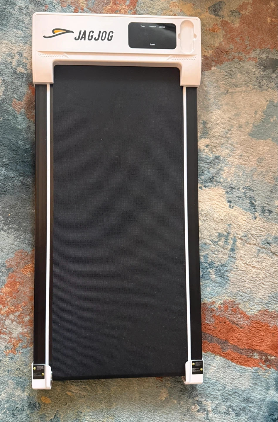 This is a JAGJOG under-desk treadmill. It's a black treadmill with a white frame and digital display. It shows time, distance, and calories burned. Perfect for walking indoors! It comes with a remote control (with a battery) so that you won’t have to bend down every time!