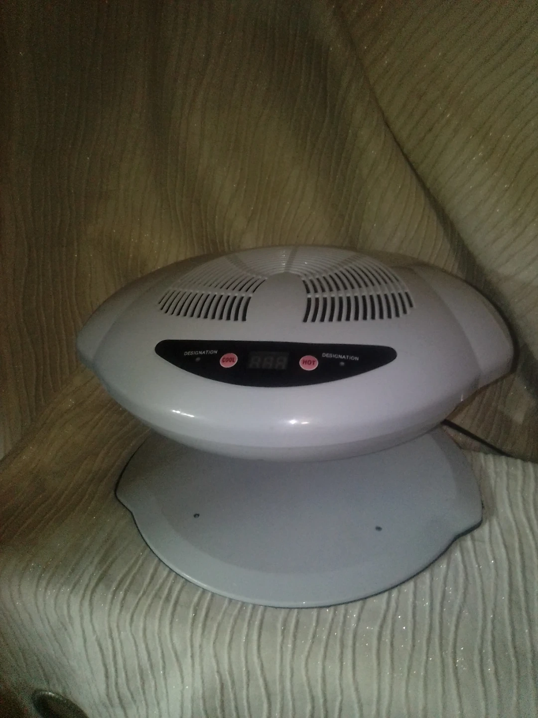 This white nail dryer features a built-in fan. It has a digital display with settings for 'cool' and 'hot'. Perfect for drying nail polish quickly!